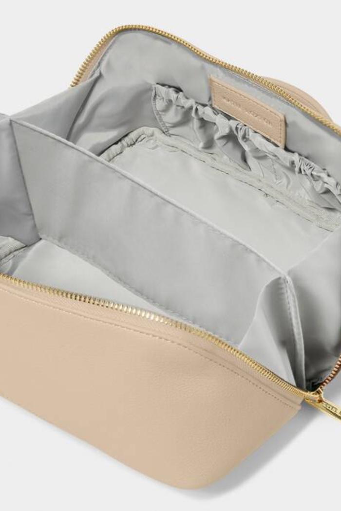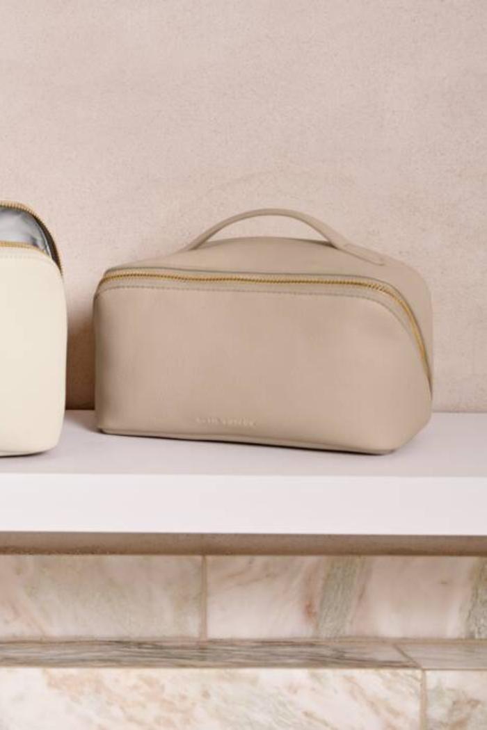 Effortlessly elevate your morning ritual with our Medium Makeup And Toiletry Bag in Light Taupe. Showcasing a top handle for convenient portability, a zip-around closure for security, and three slip pockets for optimal organization, this bag is every beauty enthusiast's dream. Carefully designed from soft vegan leather and featuring a wipeable lining, it is able to remain looking good as new for years to come. Plus, its innovative design allows it to fully open and lay flat on any surface, providing easy access to cosmetics. This stylish piece is available in small, medium, and large sizes, making a wonderful addition to any dressing table.