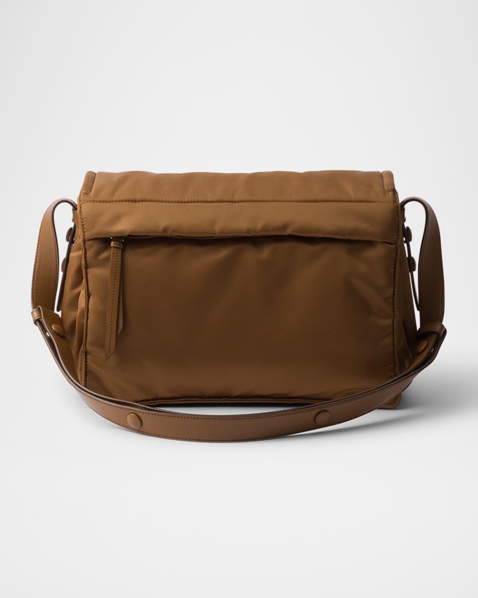 Prada shoulder bag crafted in Re-Nylon with padding for a puffy look Adjustable leather shoulder strap Flap top with magnetic closure Signature enameled metal triangle logo Exterior, one zip pocket Re-nylon lining Divided interior with magnetic closure and one zip pocket Approx. 8.5"H x 11.8"W x 4.7"D Imported