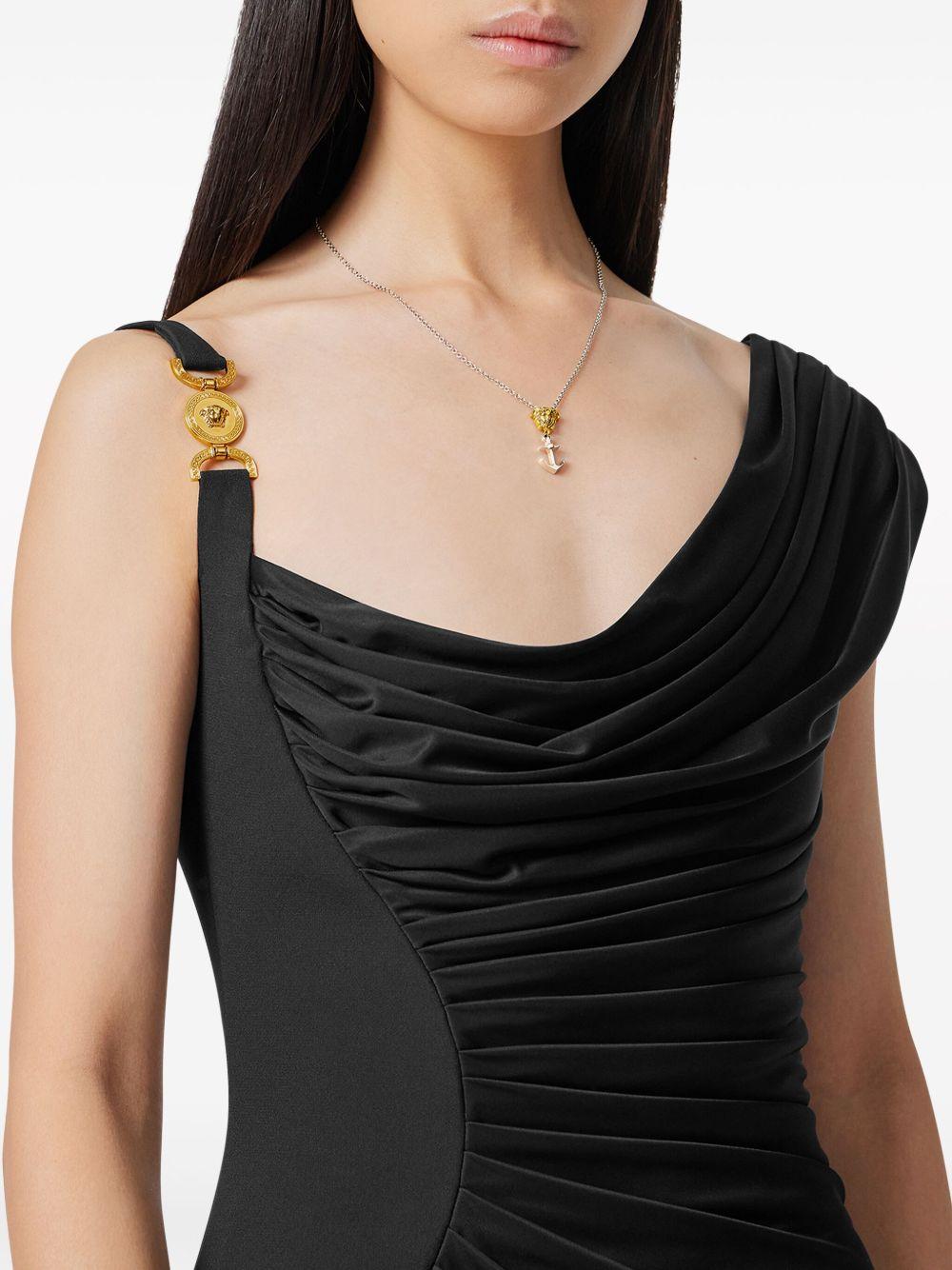 Versace Medusa '95 draped minidress | Black | black | satin finish | asymmetric and panelled design | draped detailing | Medusa Head motif | logo-engraved gold-tone hardware | cowl neck | concealed side zip fastening | sleeveless | asymmetric hem | thigh-length | Silk/Viscose/Viscose | Cocktail & Party Dresses | Dresses | Clothing | Women