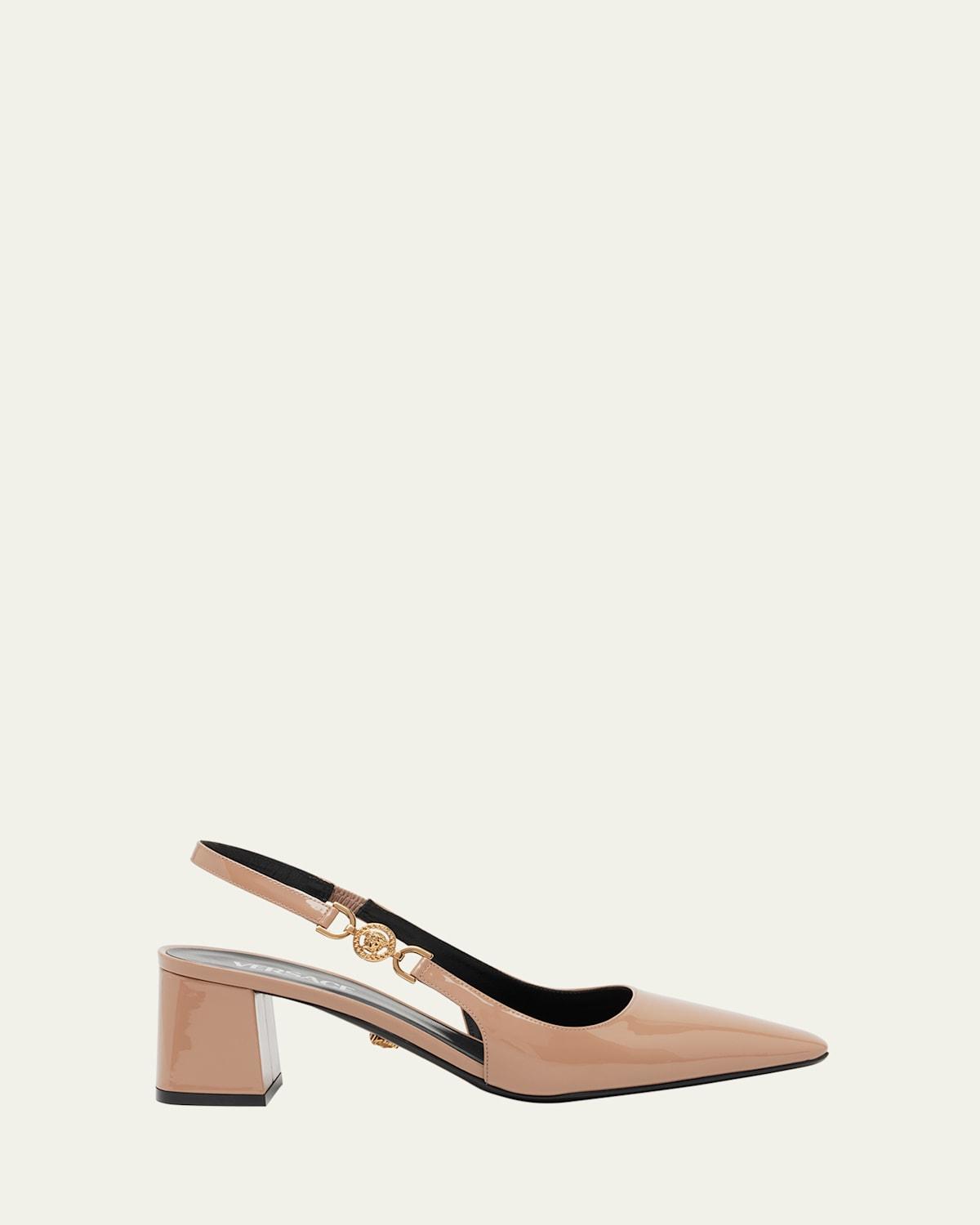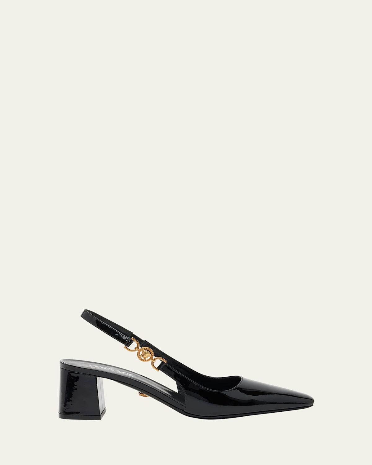 Versace patent leather pumps with golden Medusa accent 2.25 in / 55 mm block heel Square toe Stretch slingback strap Leather outsole Spot clean Made in Italy