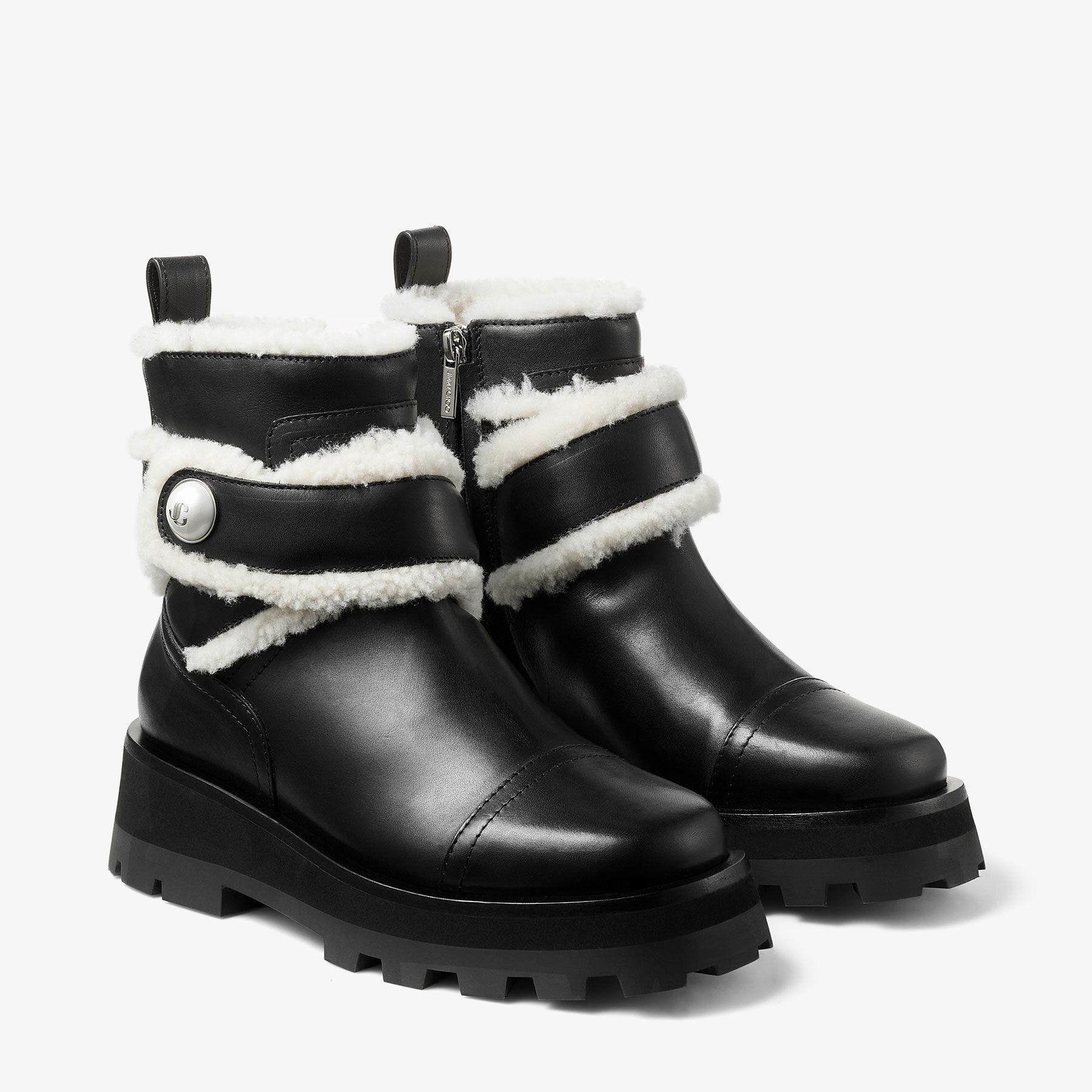 Black Shiny Calf Leather Ankle Boots with Shearling