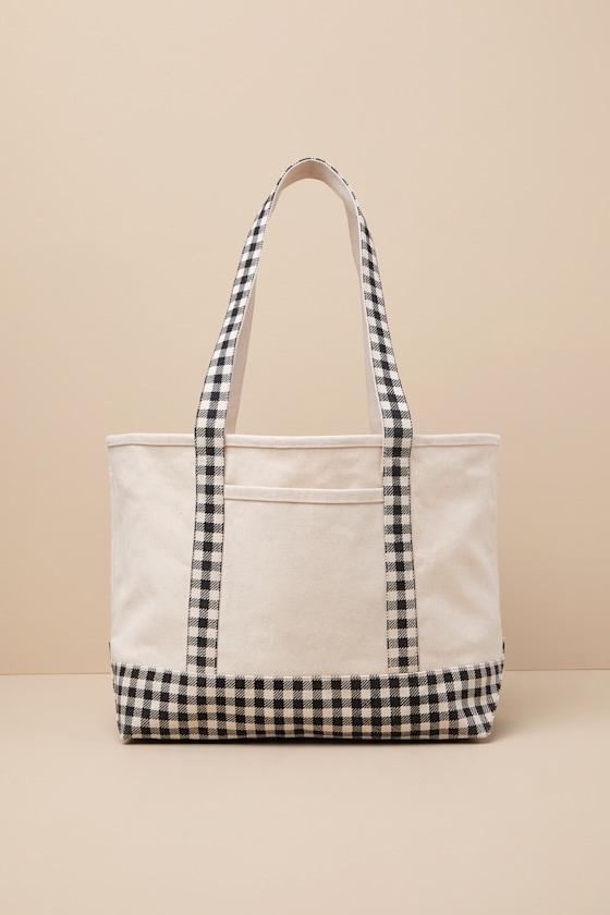 All the errands you have to run will be made easy thanks to the Lulus Meesha Beige Gingham Tote Bag! This oversized canvas tote bag is the just what you need to keep all your daily must-haves within an arm's reach. The rectangular silhouette features an exterior pocket at the front, along with a darling black and white gingham pattern that accents the flat bottom and twin tote handles. Reach into the open top to find an extra spacious interior that can hold everything you need (and more)!