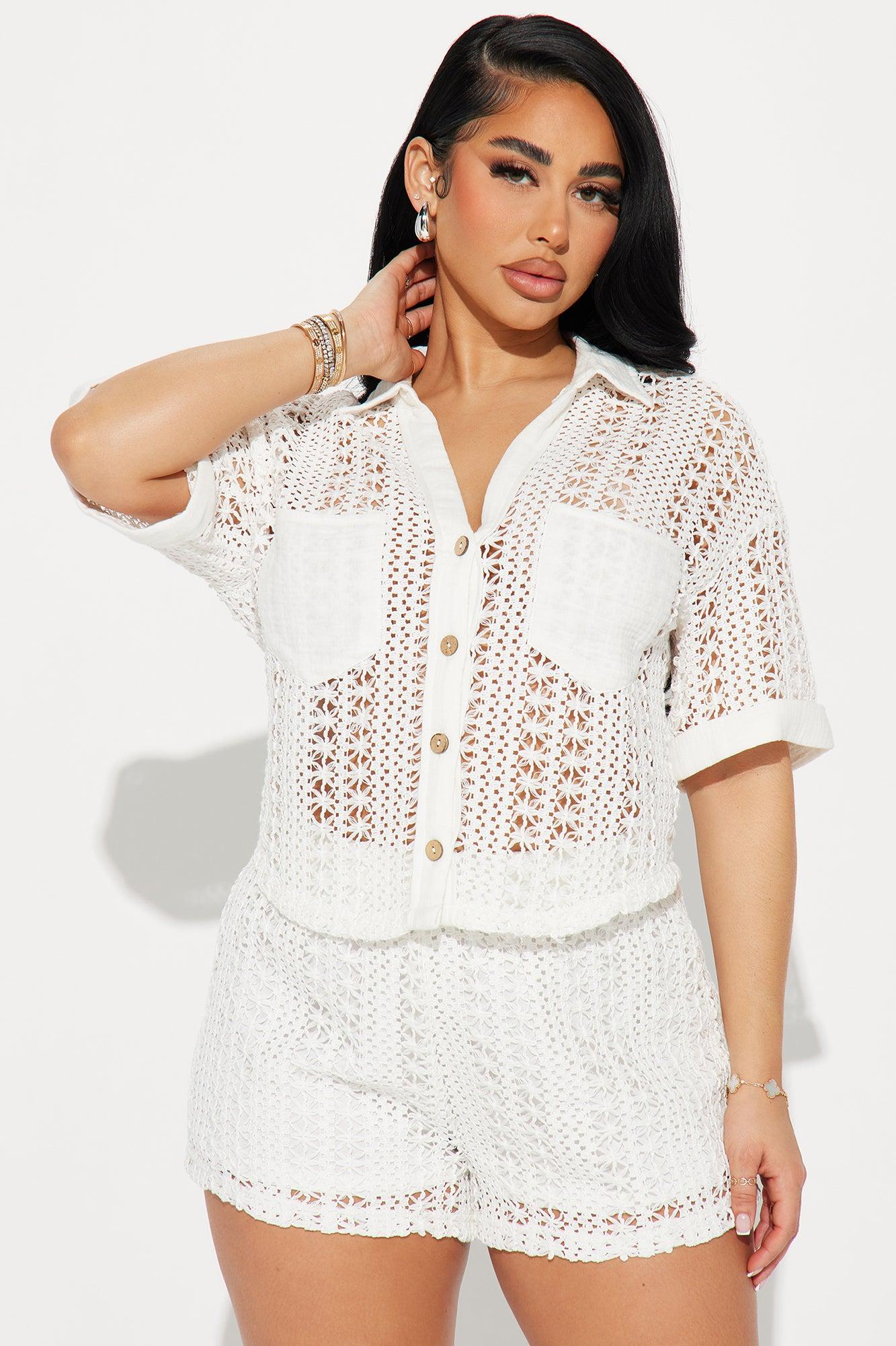 Available In Black, Rust And White. Crochet Short Set Shirt Collar Button Front High Waist Short Full Lining Elastic Waistband Top - Self 65% polyester 35% cotton Contrast: 100% Cotton Bottom - Self: 65% polyester 35% Cotton contrast 100% Polyester Imported California Proposition 65WARNING: Cancer and Reproductive Harm - www.P65Warnings.ca.gov.
