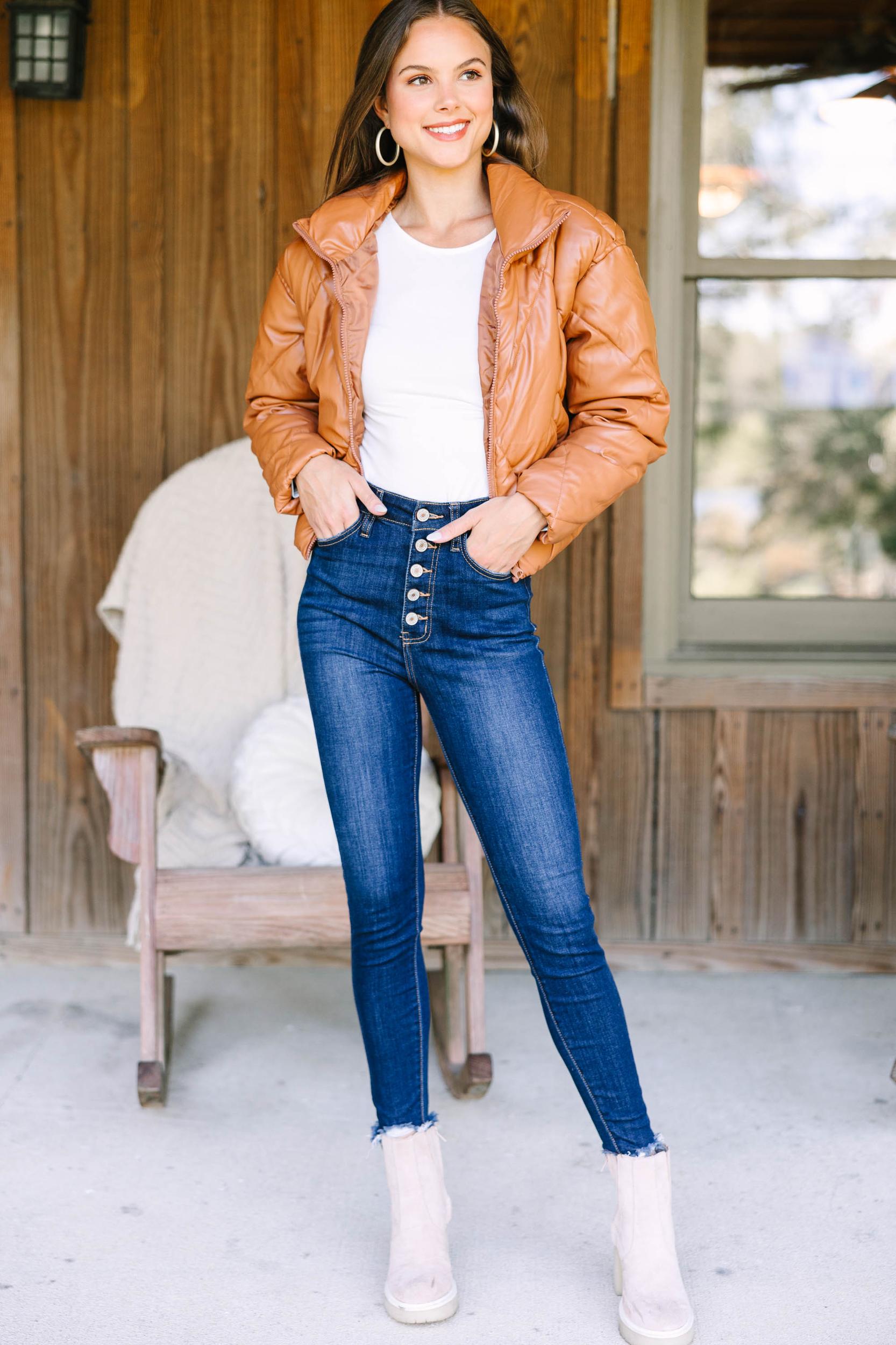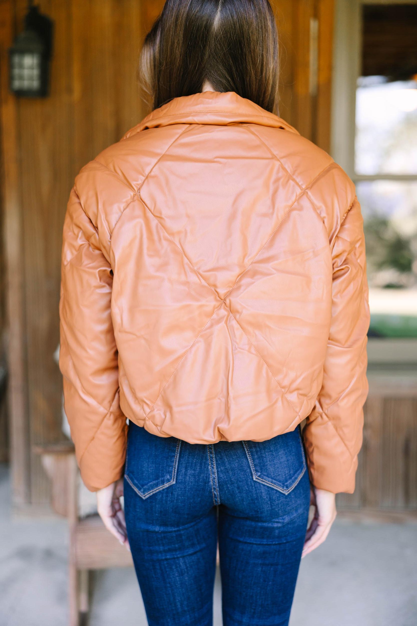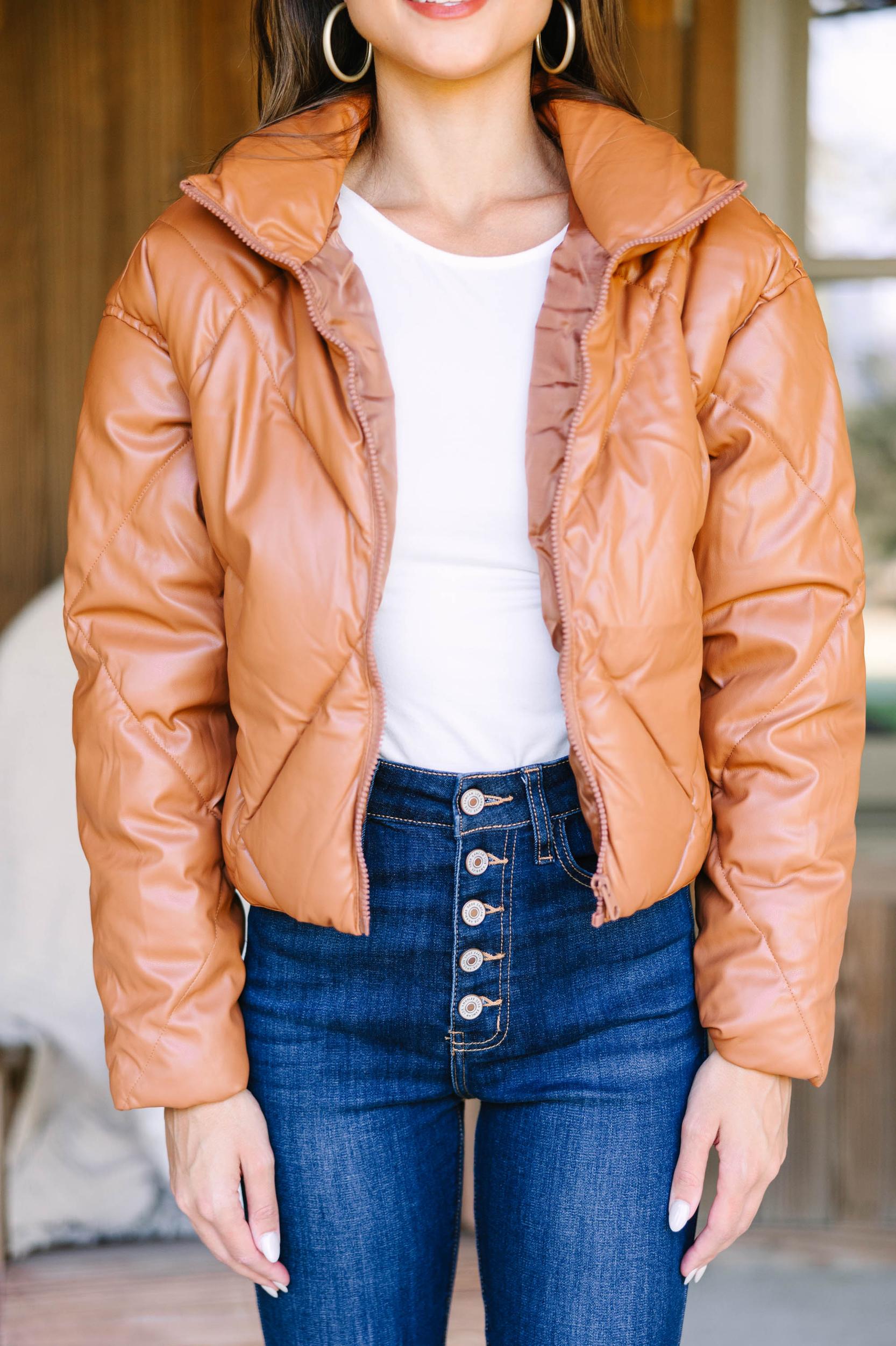 This faux leather puffer jacket is just so sassy! We are loving the trendy diamond puffer design but that faux leather makes it so trendy! This jacket is going to be beyond perfect for chilly fall and cold winter days! This puffer jacket features a cropped hem, long sleeves, a collared neckline, zip front closure, pockets, and faux leather fabric. Material has no amount of stretch.Sydney is wearing the small.