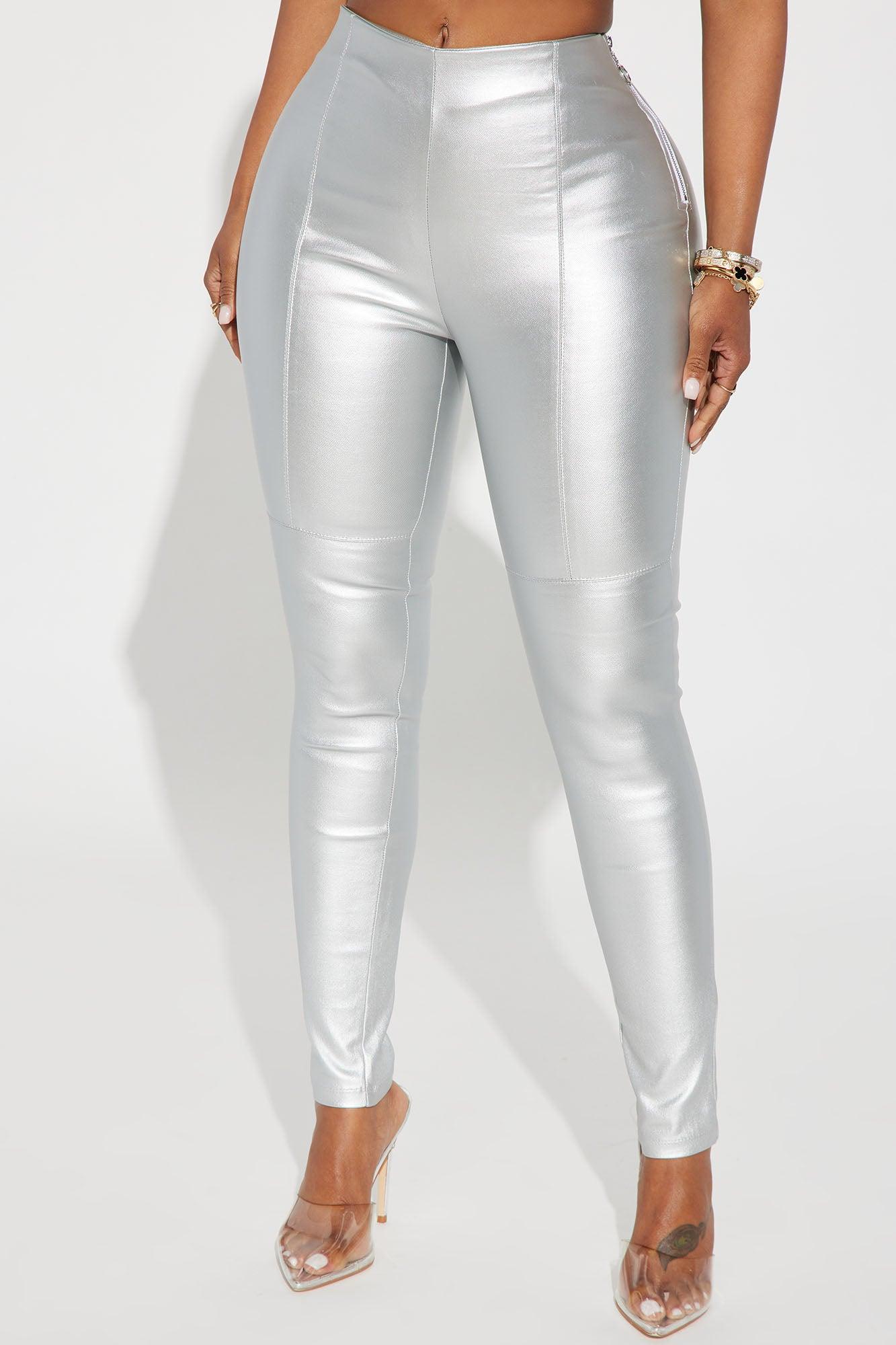 Available In Silver. Faux Leather High Rise High Waist Size Zipper Closure O- Ring Detail Faux Back Pockets Skinny Leg Coated Fabric Faux Leather Skinny Pant Disclaimer: To Keep The Aesthetic Of This Garment, Please Follow The Care Instructions Carefully. Self: 69% Rayon 26% Nylon 5% Spandex Imported