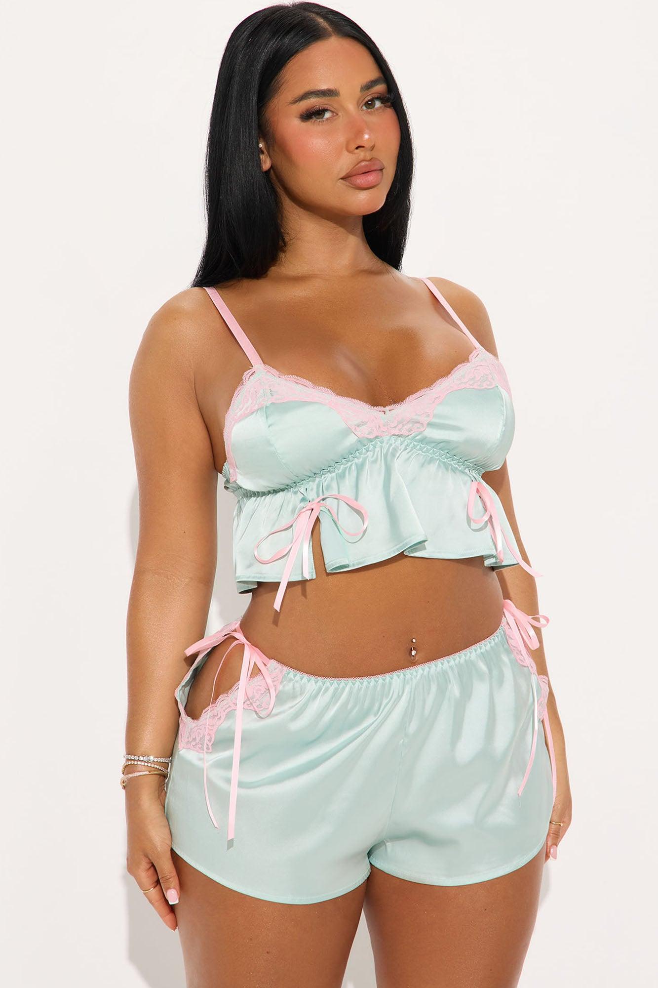 Available In Mint/combo. 2 Piece Set Satin Adjustable Straps Non Functional Front Ties Lace Trim Booty Short Elastic Waistband Stretch 97% Polyester 3% Spandex Final Sale Imported California Proposition 65WARNING: Cancer and Reproductive Harm - www.P65Warnings.ca.gov.