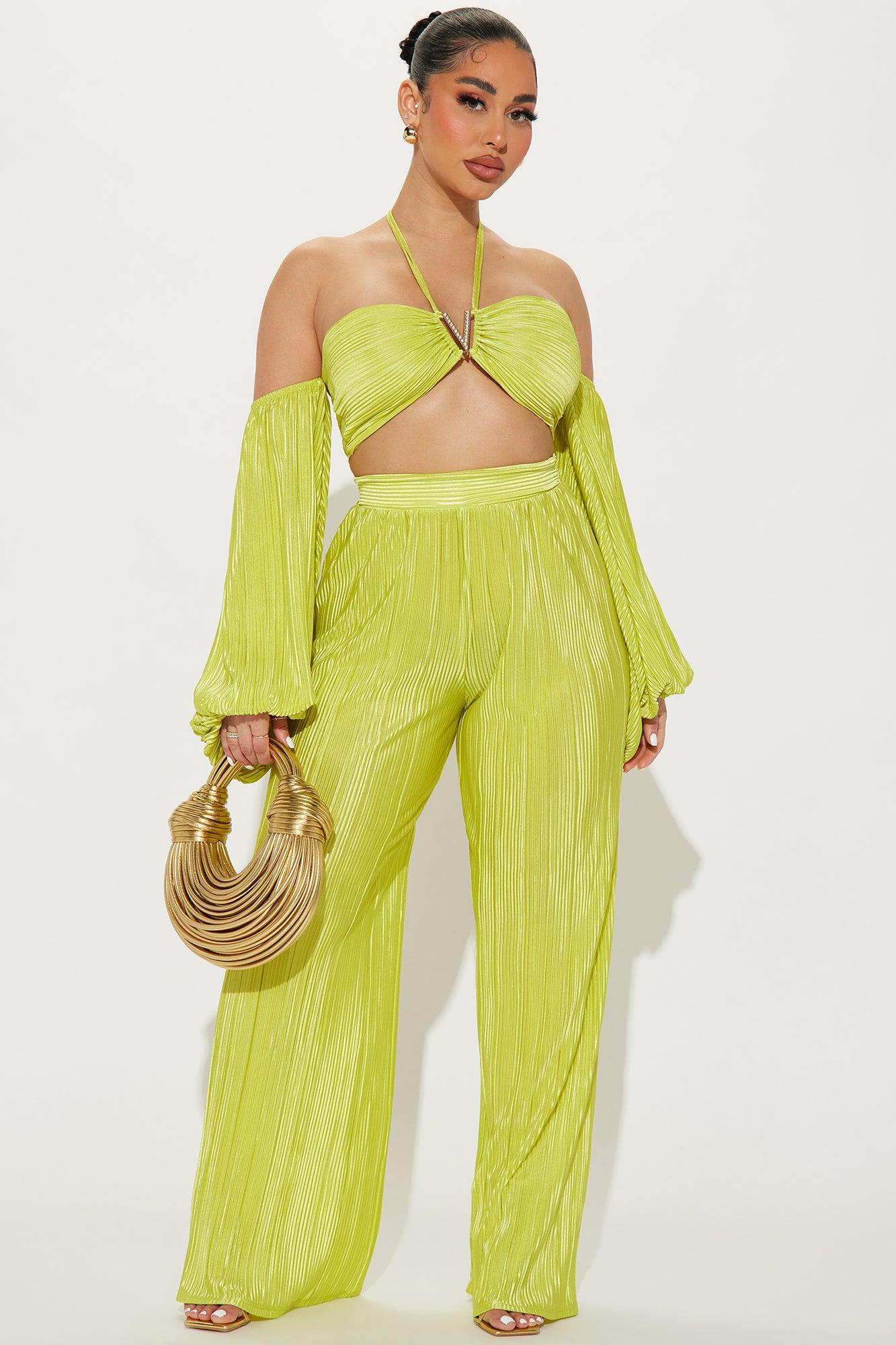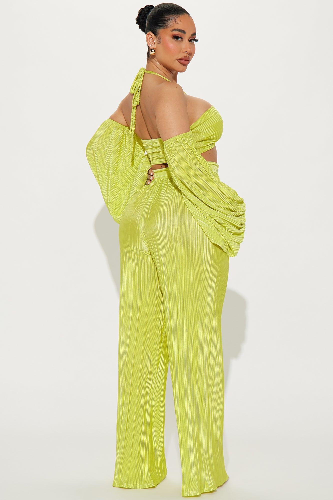 Available In Lime. Plisse Pant Set Off Shoulder Top Cropped Tie Back Back Zipper Closure Wide Leg Pant Elastic Waistband Stretch Inseam: 32" Disclaimer: Pattern Placement May Vary. 100% Polyester Imported California Proposition 65WARNING: Cancer and Reproductive Harm - www.P65Warnings.ca.gov.