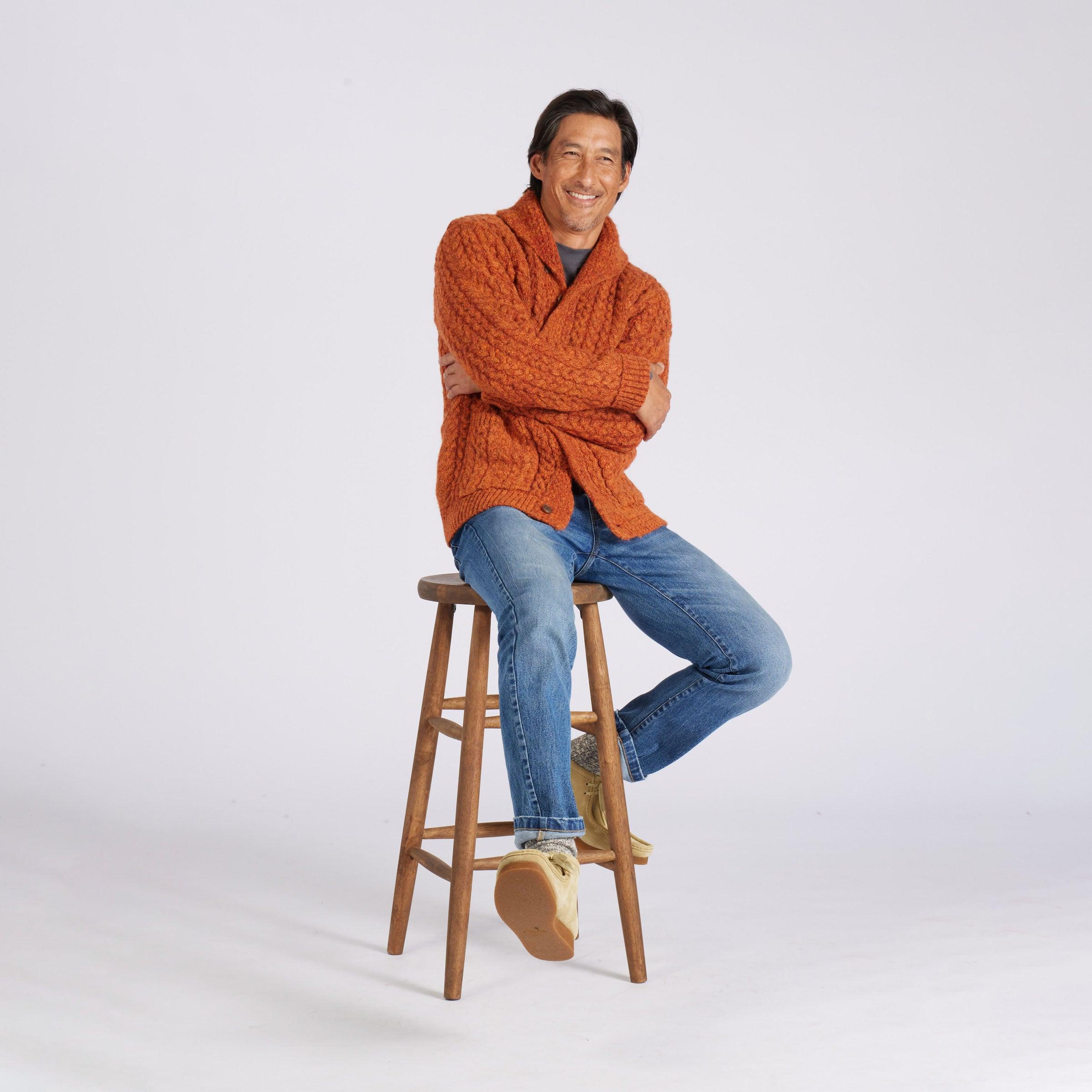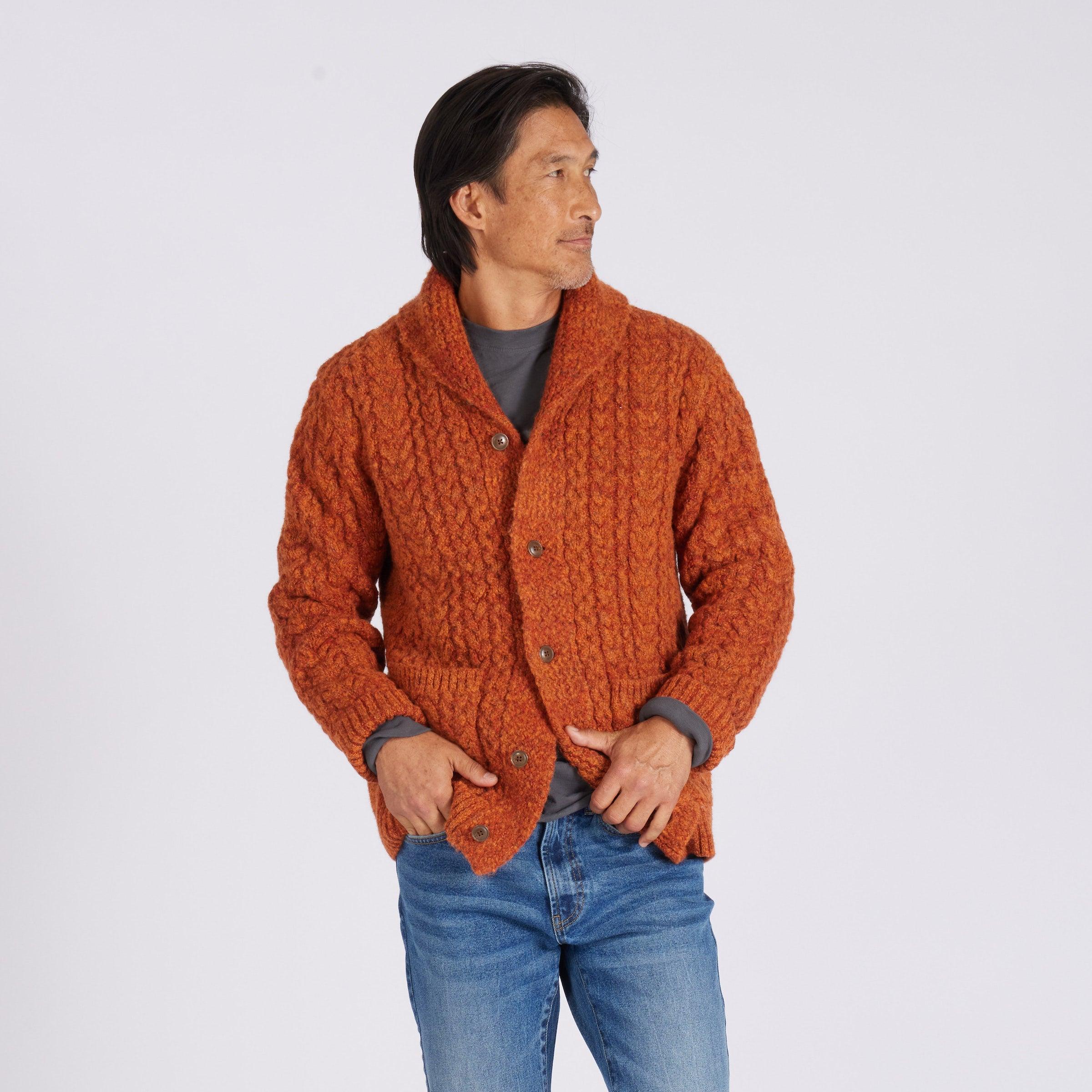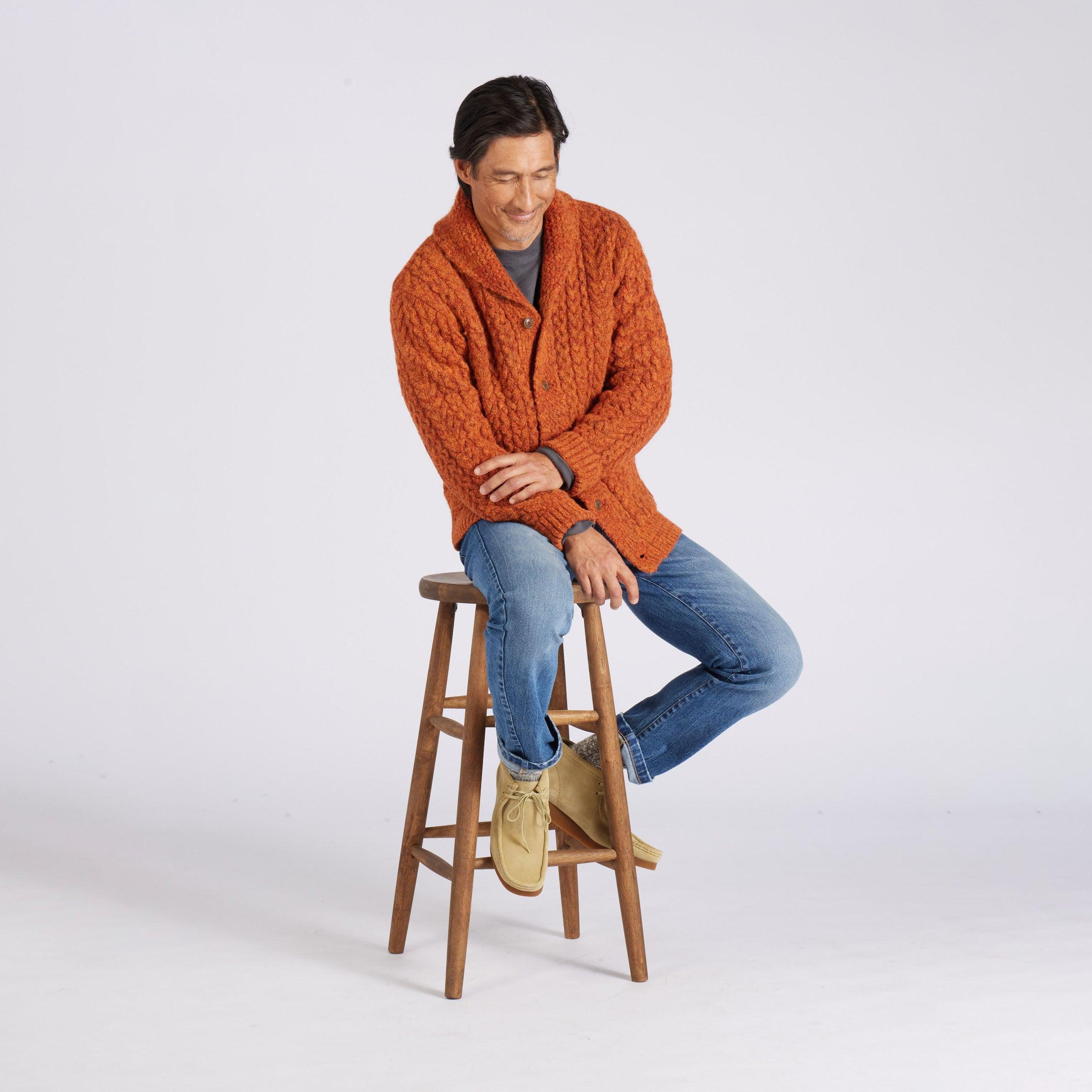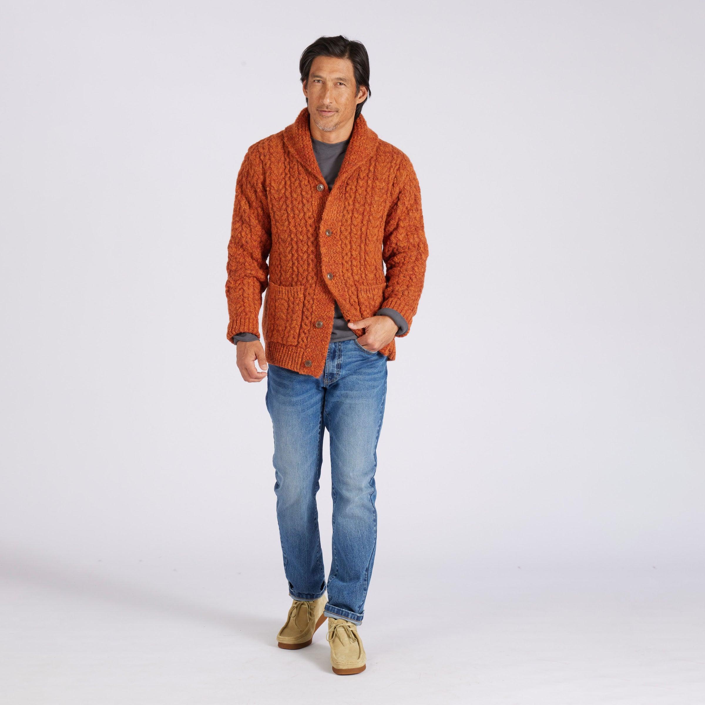 These chunky 5 gauge cardigans are virtually outwear jackets. Inspired by the oversized cardies of a bygone era, the wool alpaca blends into a single groovy garment that features high fidelity high-lows and a hand like a good shag rug. Throw this super solid over your workday oxford wherever a party needs starting, and let the good times roll. A fairly weatherproof garment, you can wear it as an outer garment in place of a jacket or a layering piece under a parka. The Model is also wearing: Dunlop Reverse Fleece Crew Neck - Beluga and Edward Stretch Straight Fit Denim - Vintage Wash. Model: Adrian is wearing size medium and is 6'. ----Details---- 5GG cable stitch Shawl collar cardigan Two patch pockets Rust horn button Imported ----Materials---- 68% Wool 22% Nylon 10% Alpaca ----Size & Fit---- Measuring Method: All measurements are in inches and based on a “flat” garment, as shown below. For comparison with one of your existing garments, please lay garment on a flat surface and follow the key measurement points. For chest and neck, if you double the flat measurement, you will get close to the full body measurement. ----Care---- Hand wash cold with similar colors Do not soak before washing Do not bleach Remove promptly after wash Lay flat to dry Do not tumble dry Cool iron on reverse side if necessary Or Dry Clean