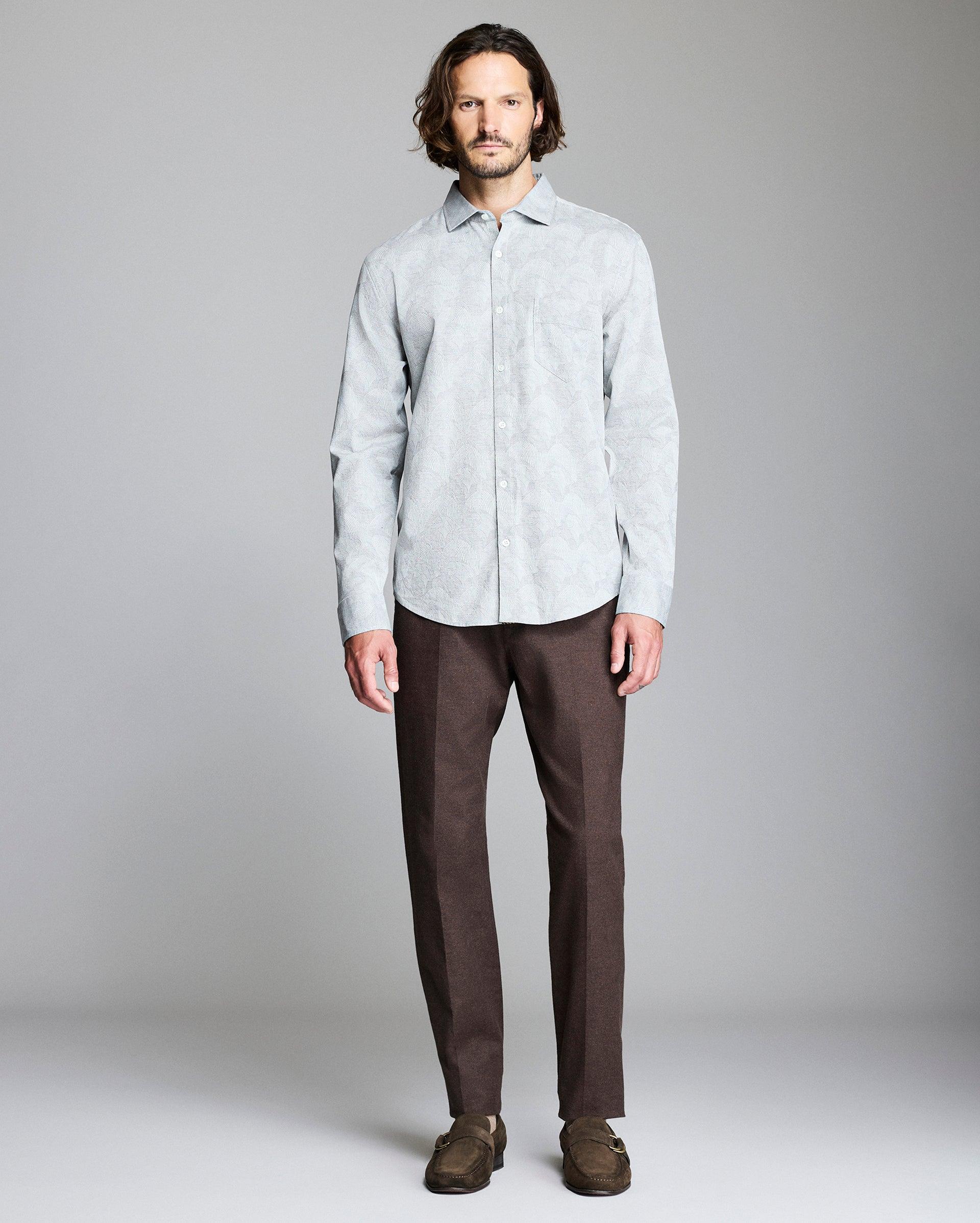 This classic shirt style features a spread collar with collar stays, our signature spade pocket with single-needle stitching, barrel cuffs, a French placket, and a tonal thread throughout the body. This version comes in our custom Flow jacquard, exclusive to Billy Reid, and is crafted in a standard fit that looks great