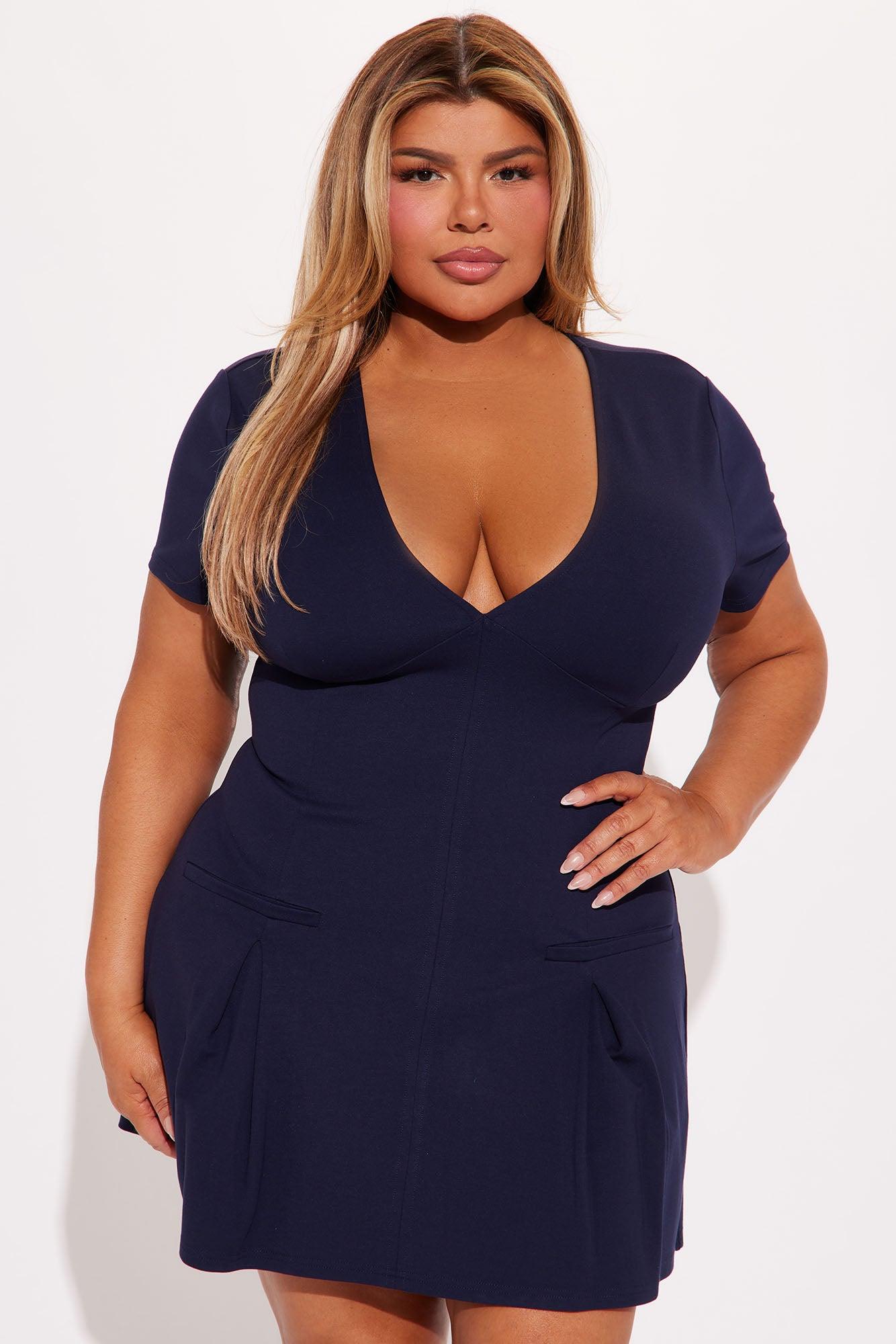 Available In Navy And Taupe. Pleated Micro Mini Dress Deep v-neck Short sleeves Faux pockets Pleated Back zipper Stretch Length measured flat = 31" 63% Rayon 32% Nylon 5% Spandex Imported California Proposition 65WARNING: Cancer and Reproductive Harm - www.P65Warnings.ca.gov.