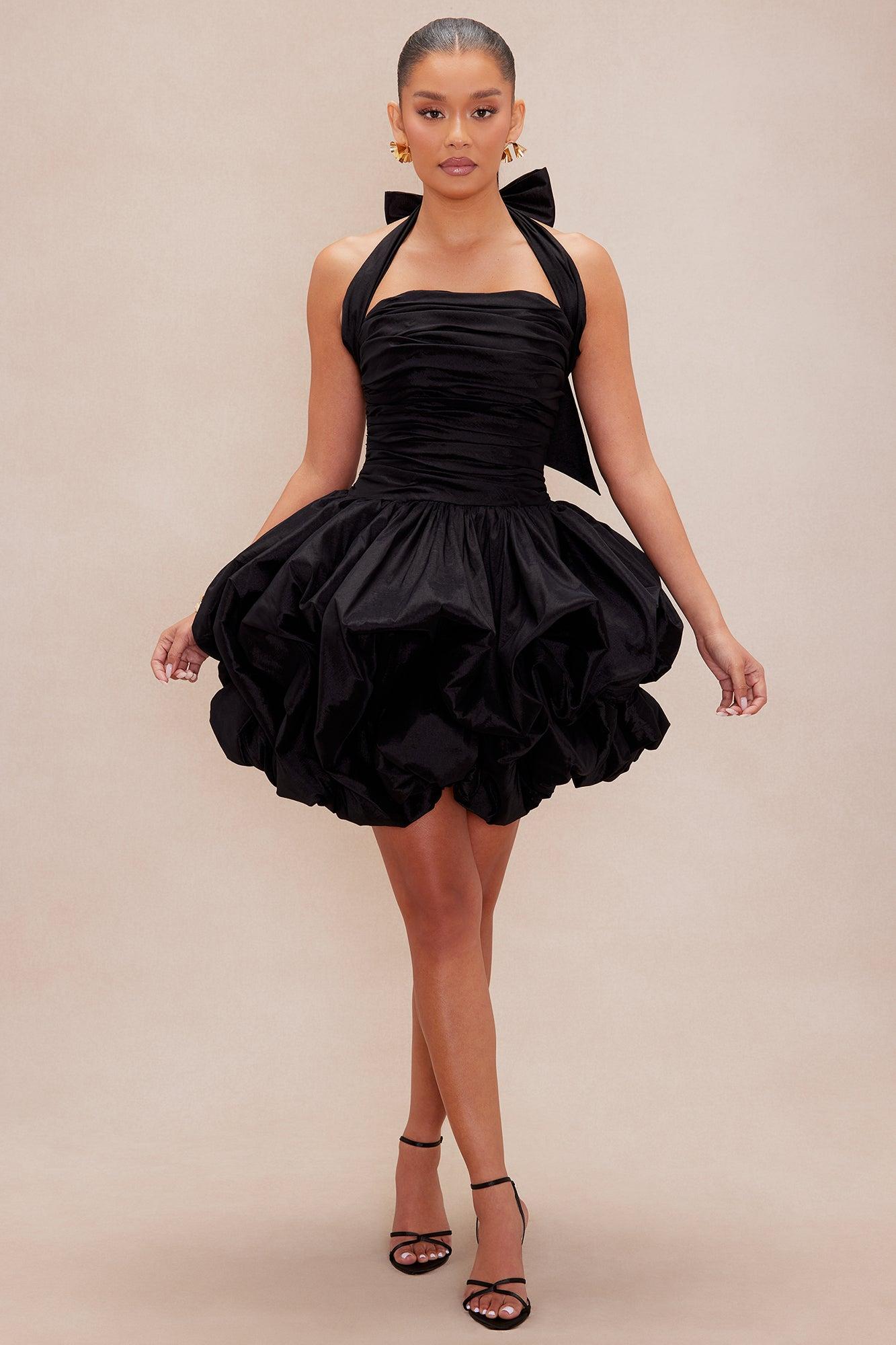 Available In Black And Hot Pink. Taffeta Mini Dress Y Neckline Sleeveless Grip Tape Boning Ruched Bubble Hem, Pleated Back Zipper Closure Lined Non Stretch Length= 30.5'' Shell: 55% Polyester 40% Nylon 5% Spandex Lining: 100% Polyester Imported