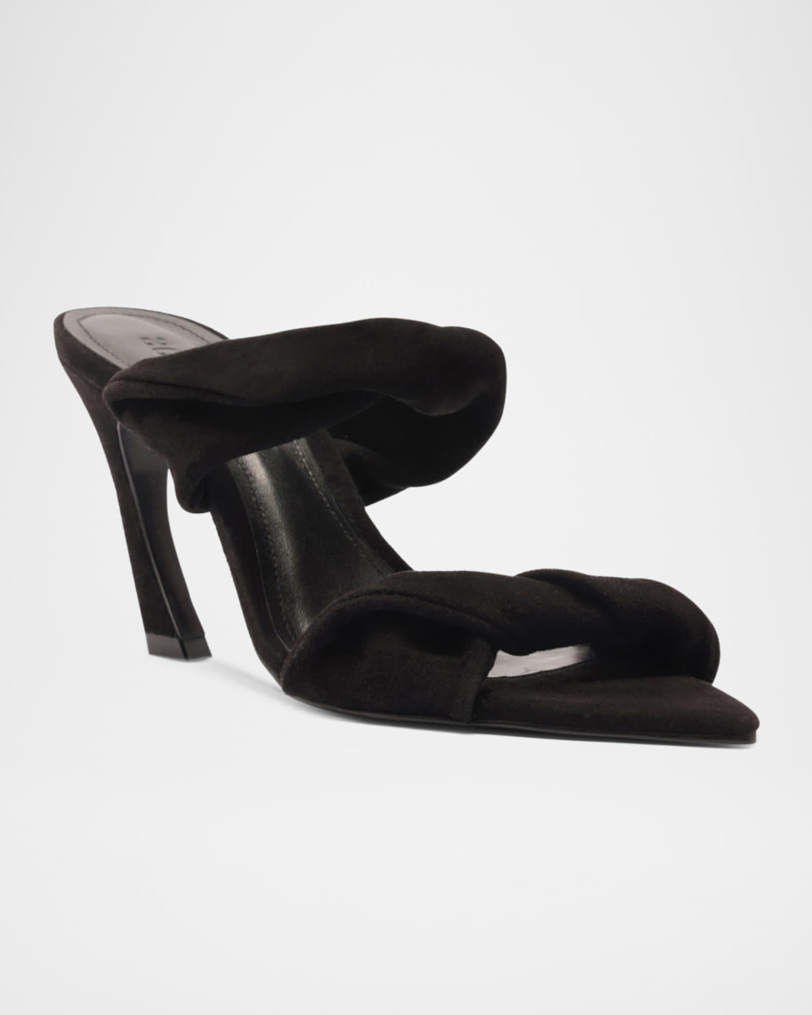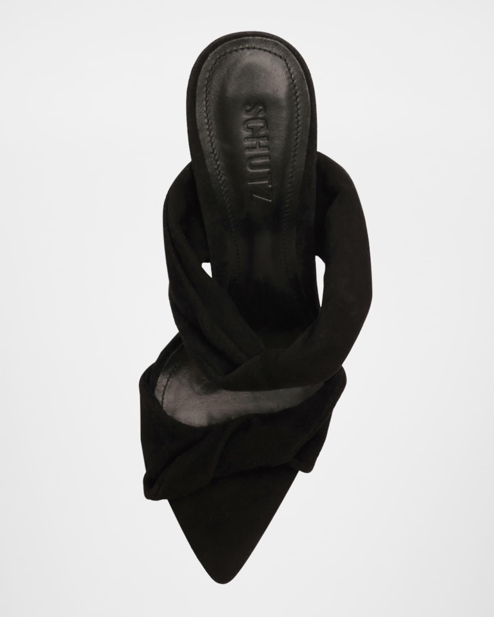 Schutz "Meline" leather mule sandals blend texture, structure, and undeniable presence with twisted suede straps 3.50 in / 90 mm stiletto heel Pointed open toe Dual-band vamp Slip-on style Leather outsole Lining: Synthetic Spot clean Made in Brazil