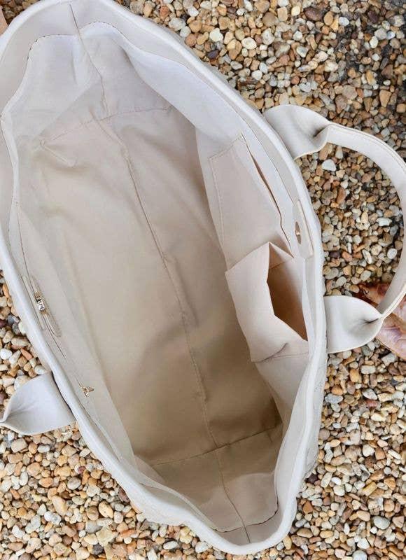 This oversized tote is the best go-to handbag! It has two short top handles as well as two elongated braided handles to carry on your shoulder. The Caroline Hill logo is centered at the top of this bag on one side. It has a magnetic closure leading to the roomy interior of the bag. It has one zippered pocket and two open pockets inside. There are also feet on the bottom of the bag for added protection. It's the perfect size for travel, carrying a laptop, or for everyday fashion.