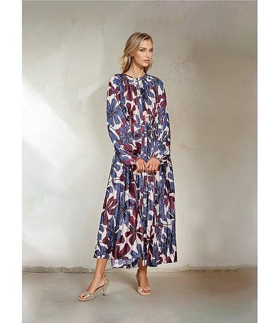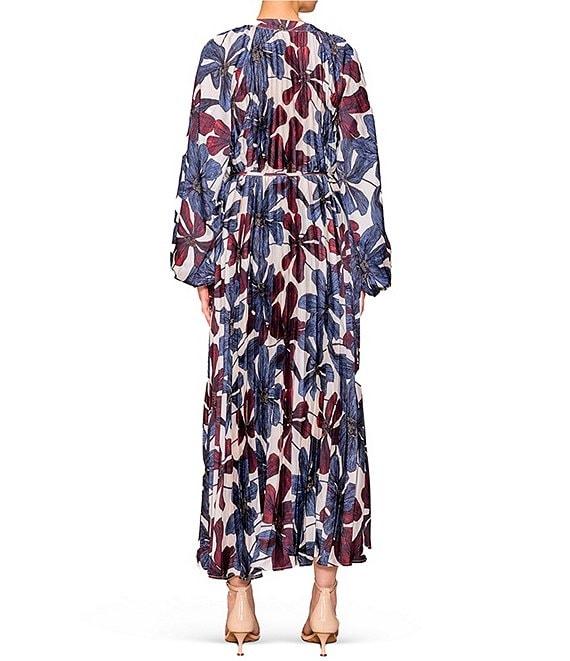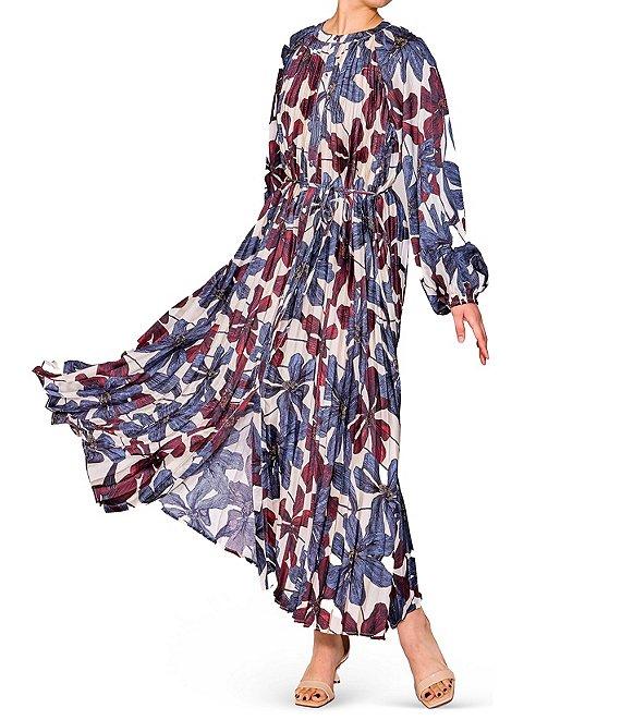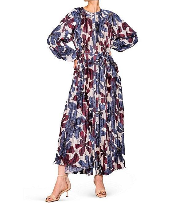 MELLODAY Floral Pleated Long Sleeve Button Front Tie Waist Maxi Dress