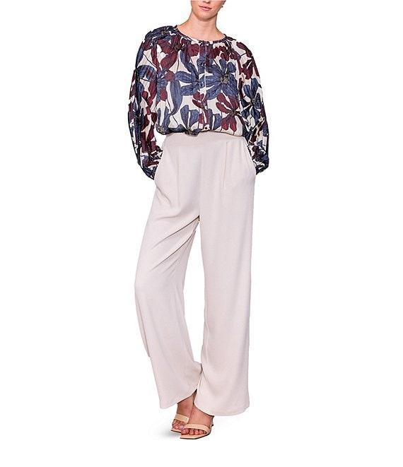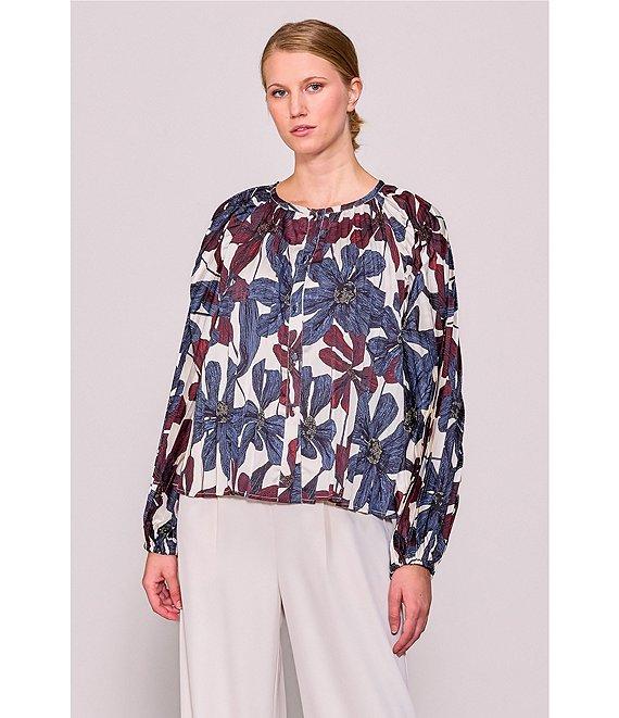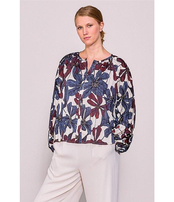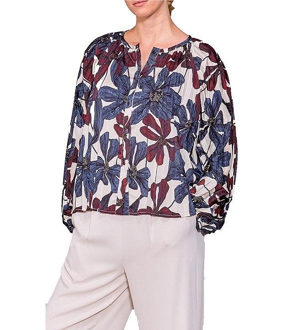 MELLODAY Floral Pleated Long Sleeve Button Front Top