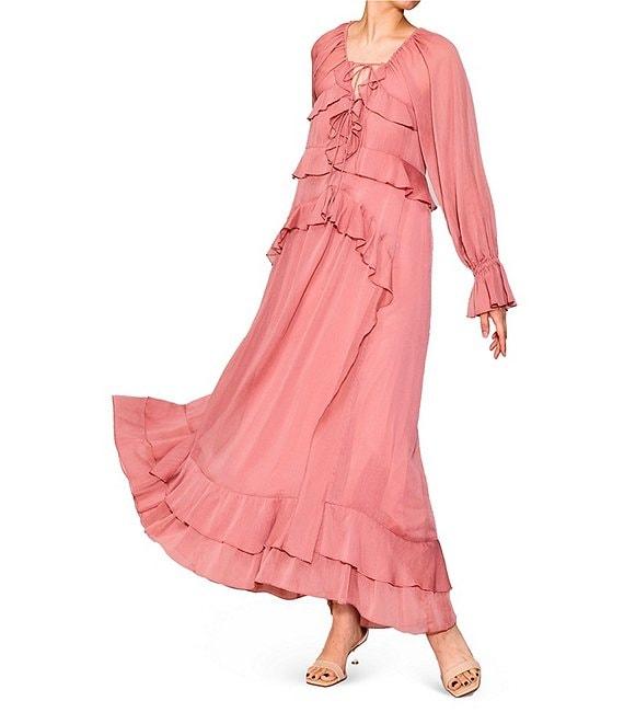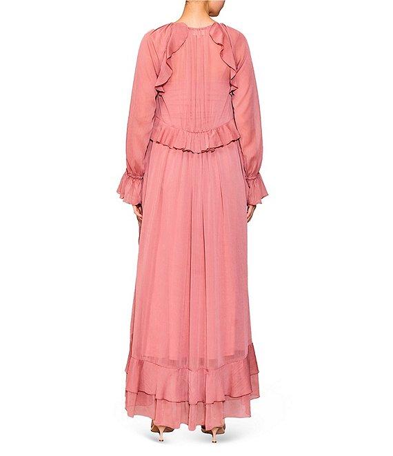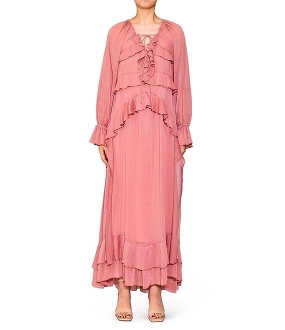 From MELLODAY, this dress features: Chiffon fabrication V-neckline with tie detail Long sleeves with elastic ruffle cuffs Tiered ruffle details Side seam pockets Lined Pullover construction Approx. 53.5" length Polyester/ spandex Hand wash Imported.