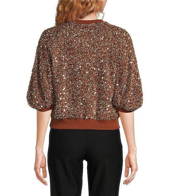 MELLODAY Sequin Crew Neck Short Puff Sleeve Top