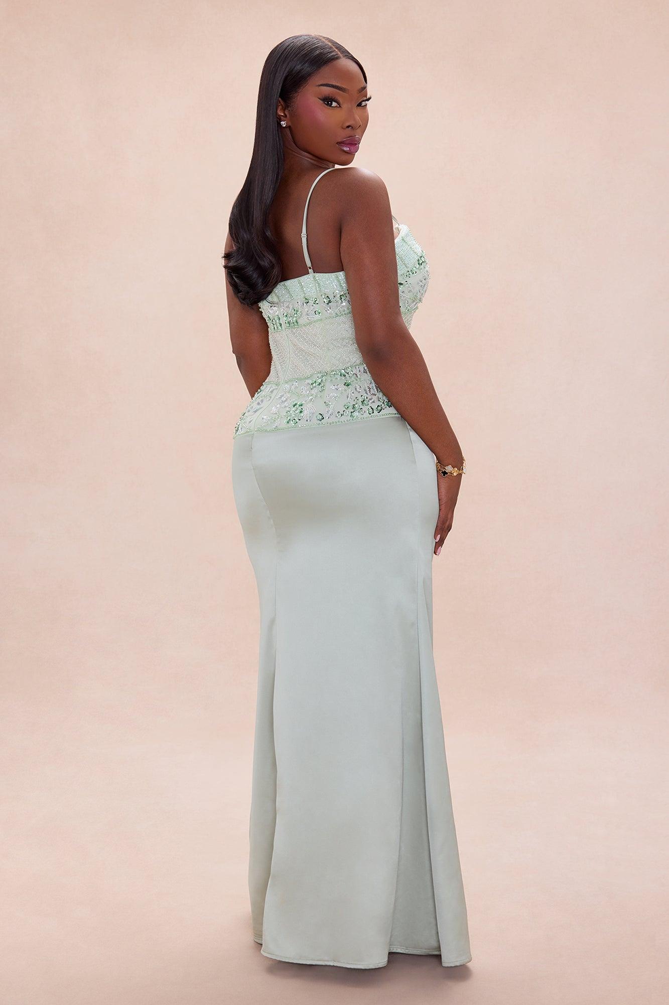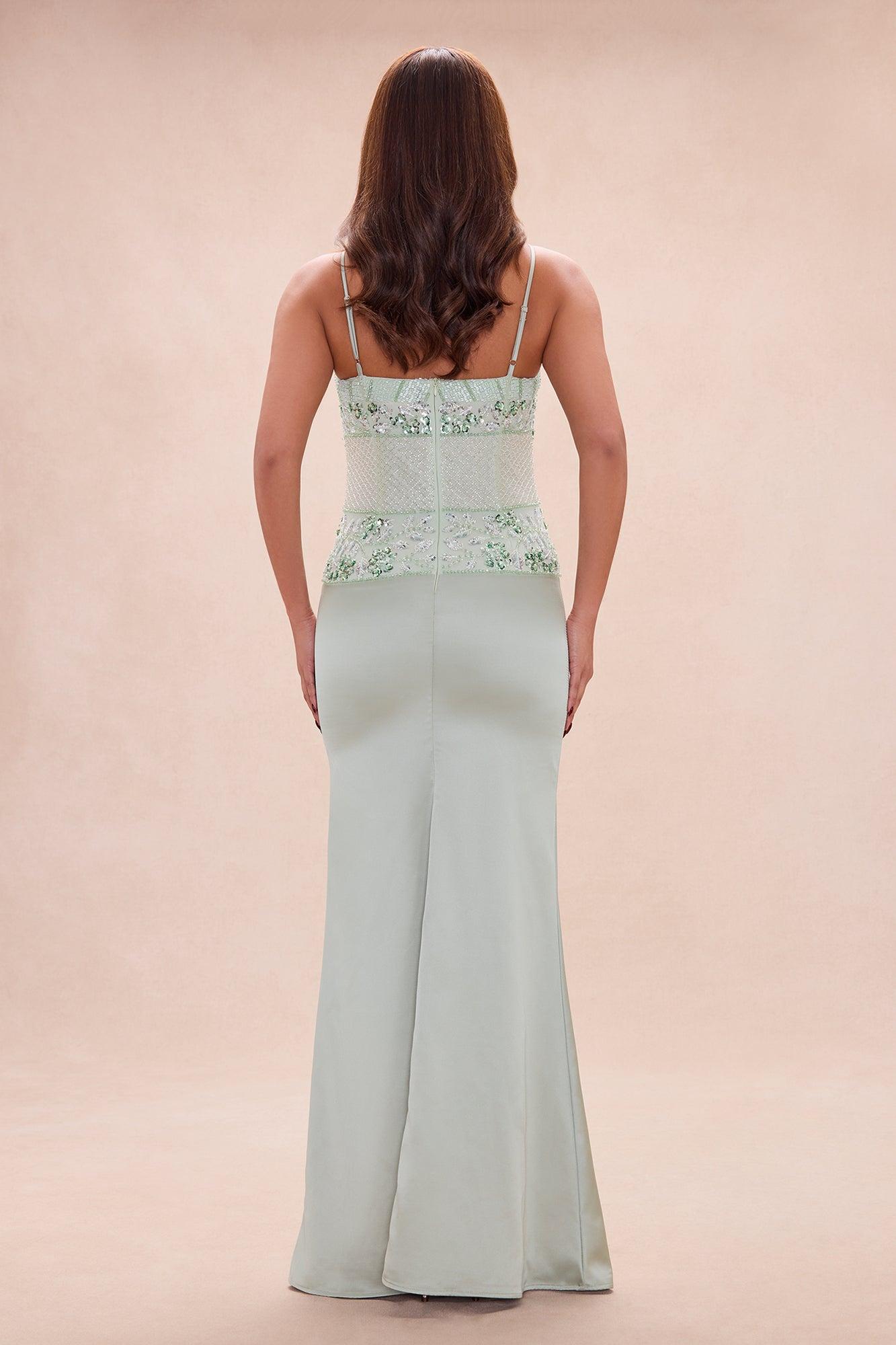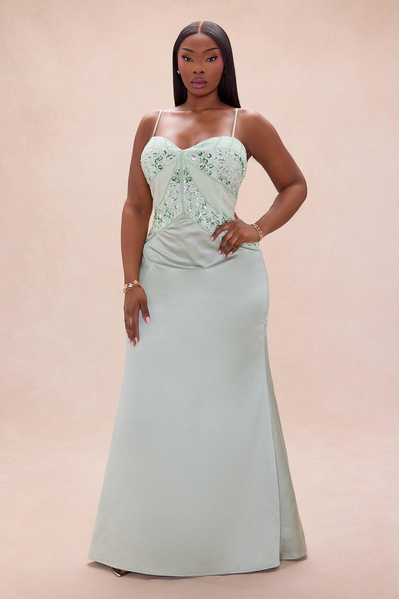 Available In Sage. Satin Maxi Dress Adjustable Spaghetti Straps Sweetheart Neckline Grip Tape Padded Bra Cups Embellished Detailing Hidden Back Zipper Closure Lined Non Stretch Self: 78% Polyester 20% Rayon 2% Spandex Lining: 100% Polyester Imported
