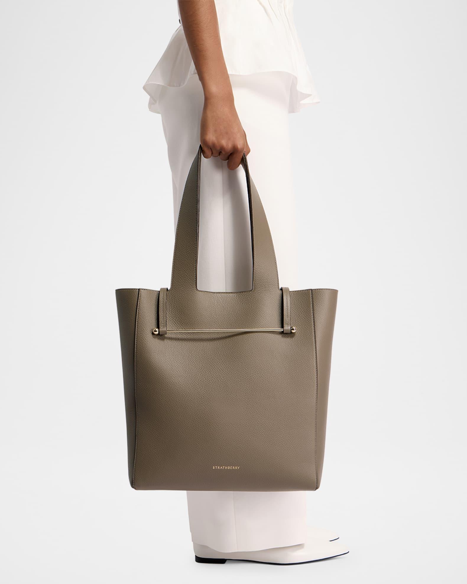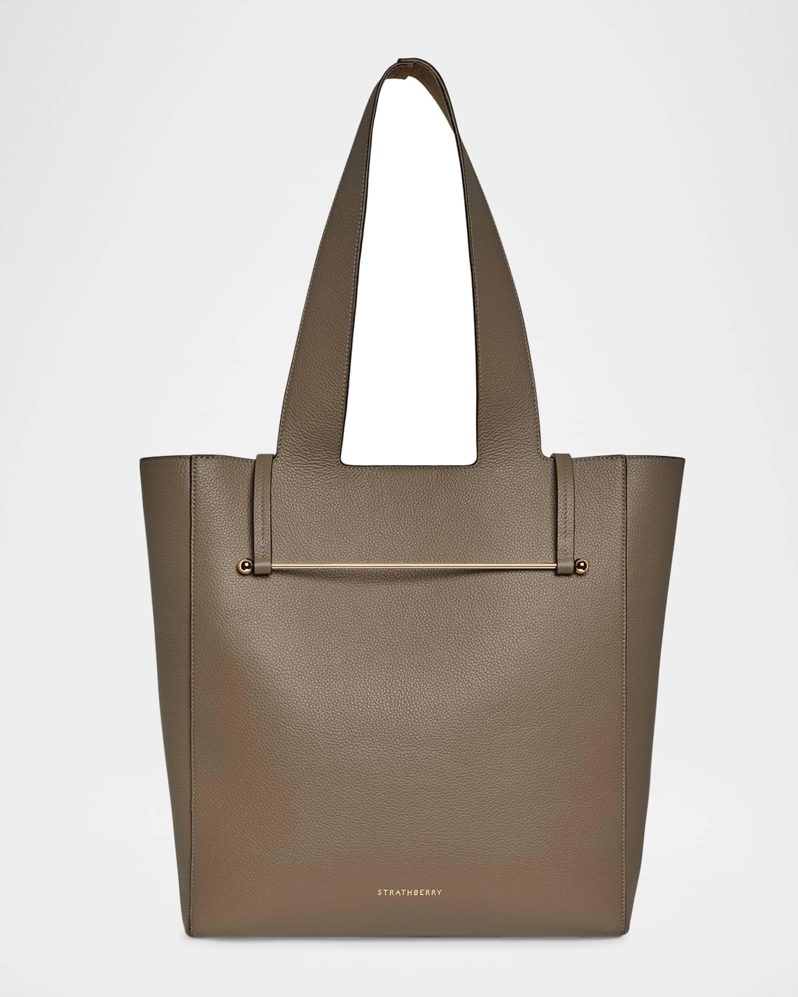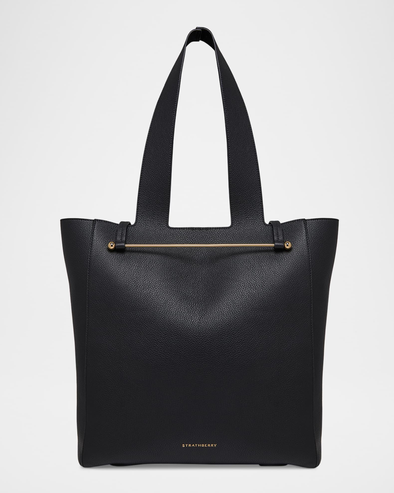 STRATHBERRY "Melody" tote bag in grained calf leather and polyester Logo lettering and metal bar accent on the front Flat top handles Magnetic closure Interior, one detachable zip pouch Leather lining Item Weight (Lbs.): 2.1 Approx. 14.2"H x 13.4"W x 4.7"D Made in Spain