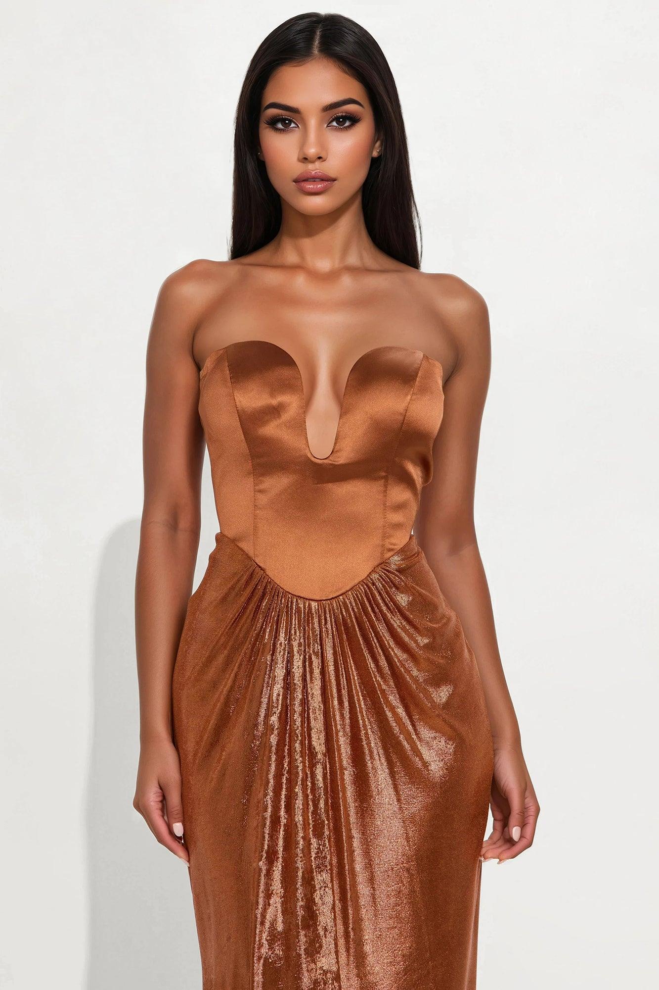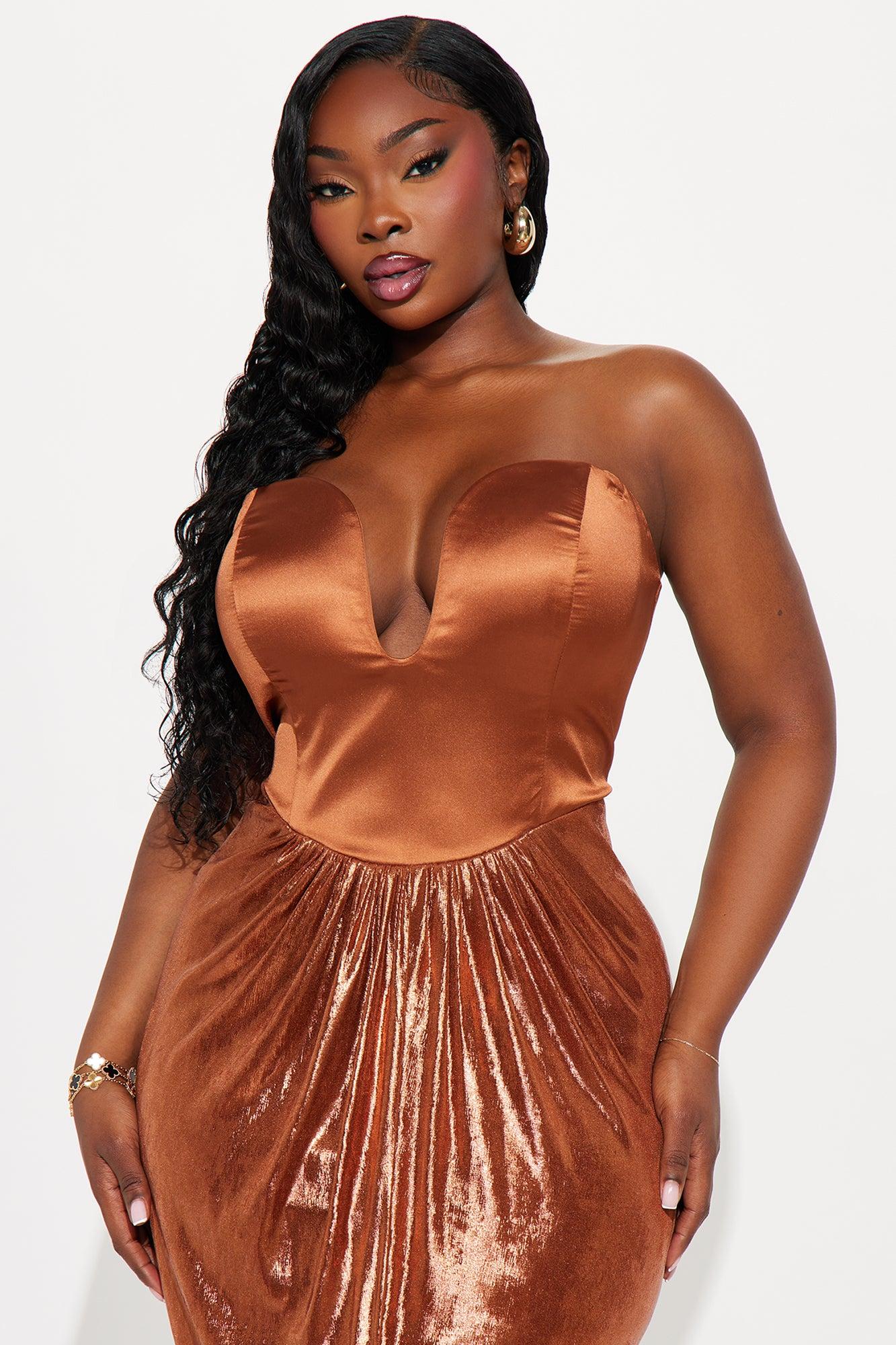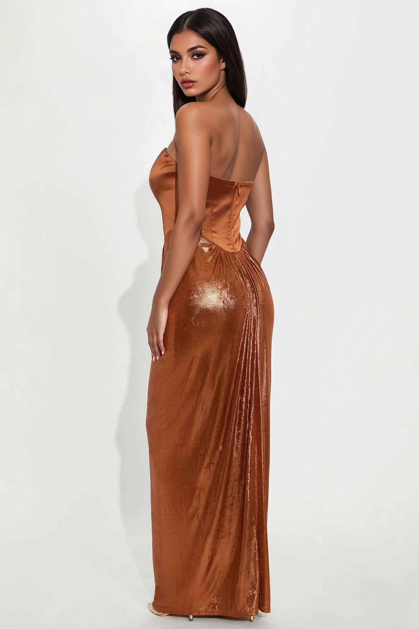 Available In Cognac. Metallic gown Strapless Deep V- Neckline Grip Tape Padded Bra Cups Boning Drop Waist Draped Detail Lined Partial Stretch Self : 96% Polyester 4% Spandex Contrast : 96% Polyester 4% Spandex Lining : 100% Polyester Imported