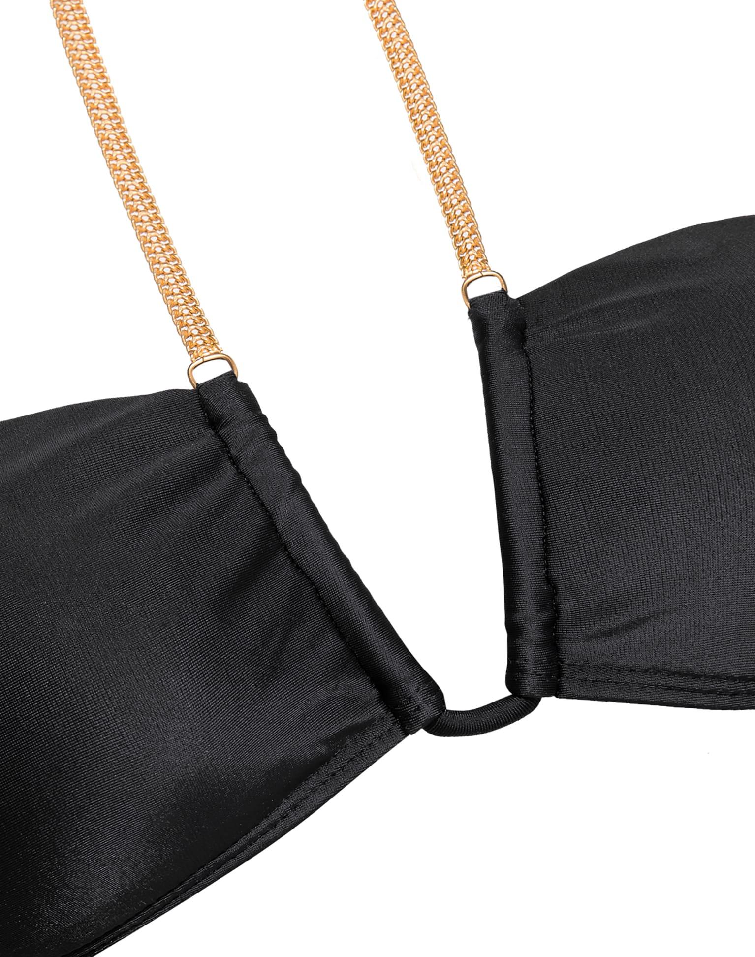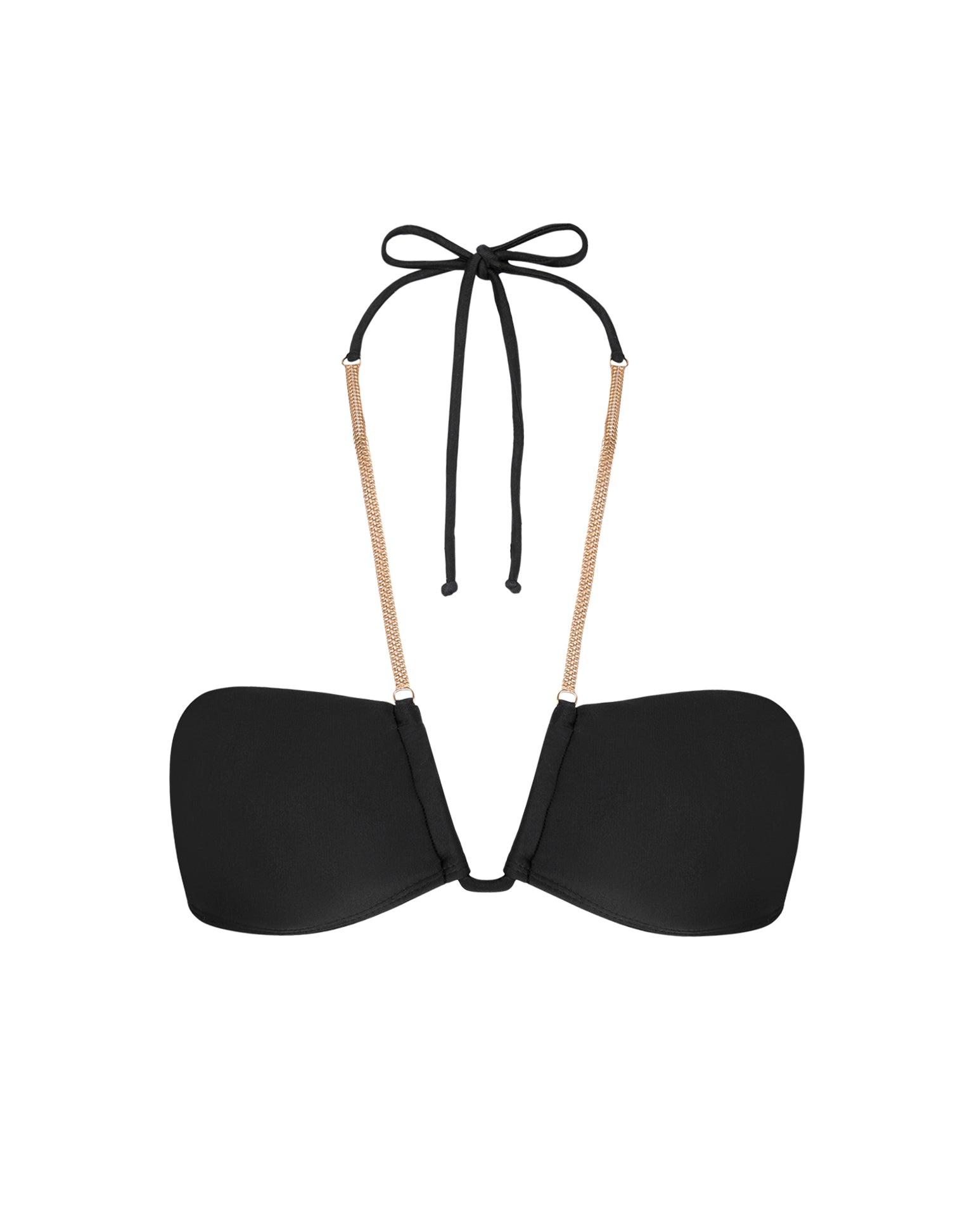 Bandeau-style top with a halter neckline embellished with a 24k gold-plated chain. Pair with a matching bottom and a cover up for a stylish, effortless look. Features: Removable padding Fully lined Back clasp closure 24K gold plated detail U-neck detail Style# 065-856-001
