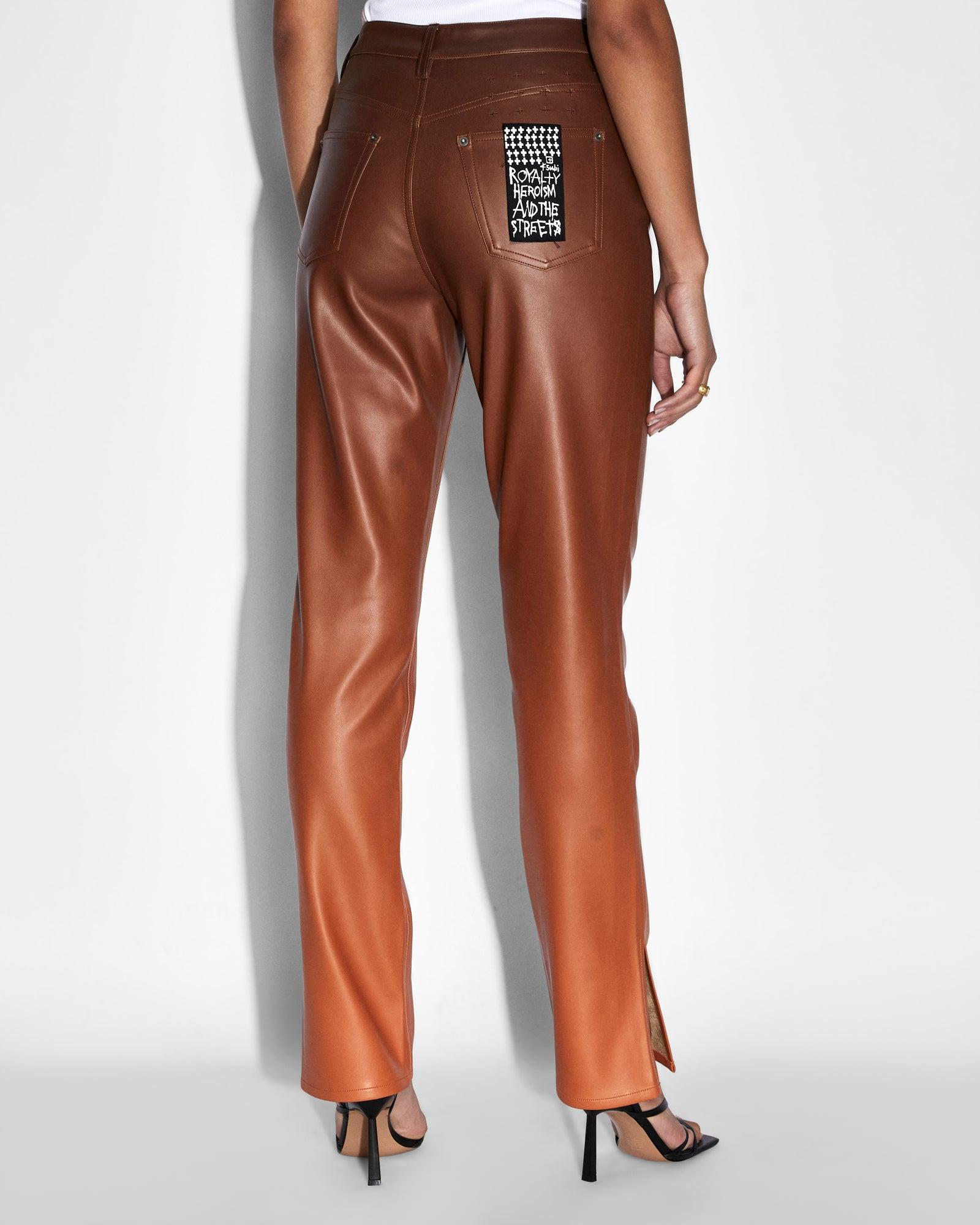 The Melrose Pant Sunset is constructed from premium faux leather in an exclusive brown ombre print with tonal stitching and a soft hand feel. This style is designed as a high rise, slim cigarette fit pant with classic five pocket detailing and side seam splits. Signed off with our iconic Ksubi branding. Pair with the 'Zephyr Duster Sunset' for a high impact, full ombre look.Please note: this style will not come with a back pocket tag. Dry clean only