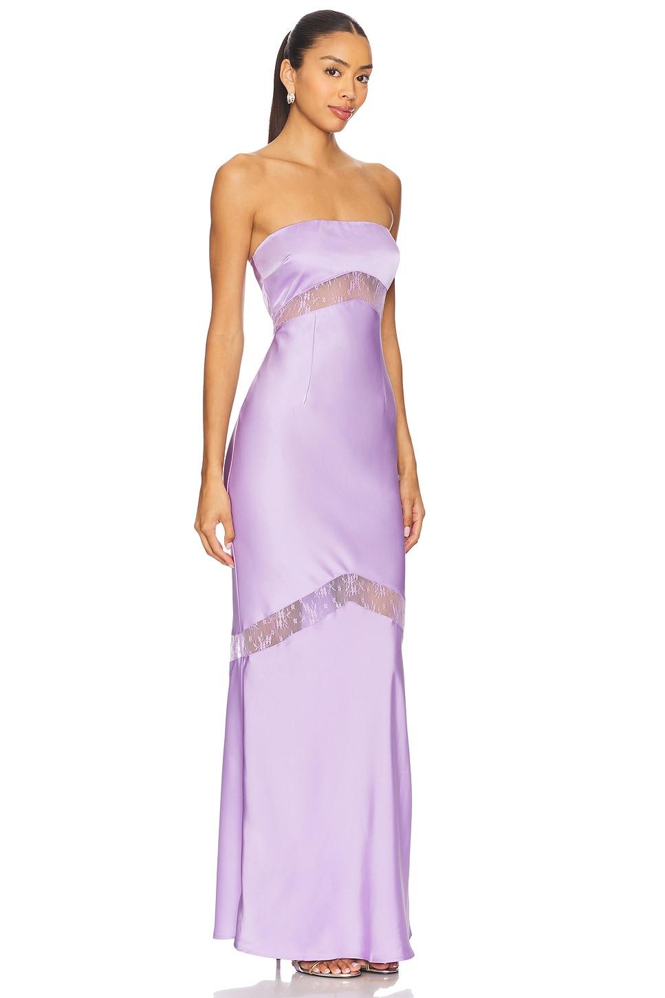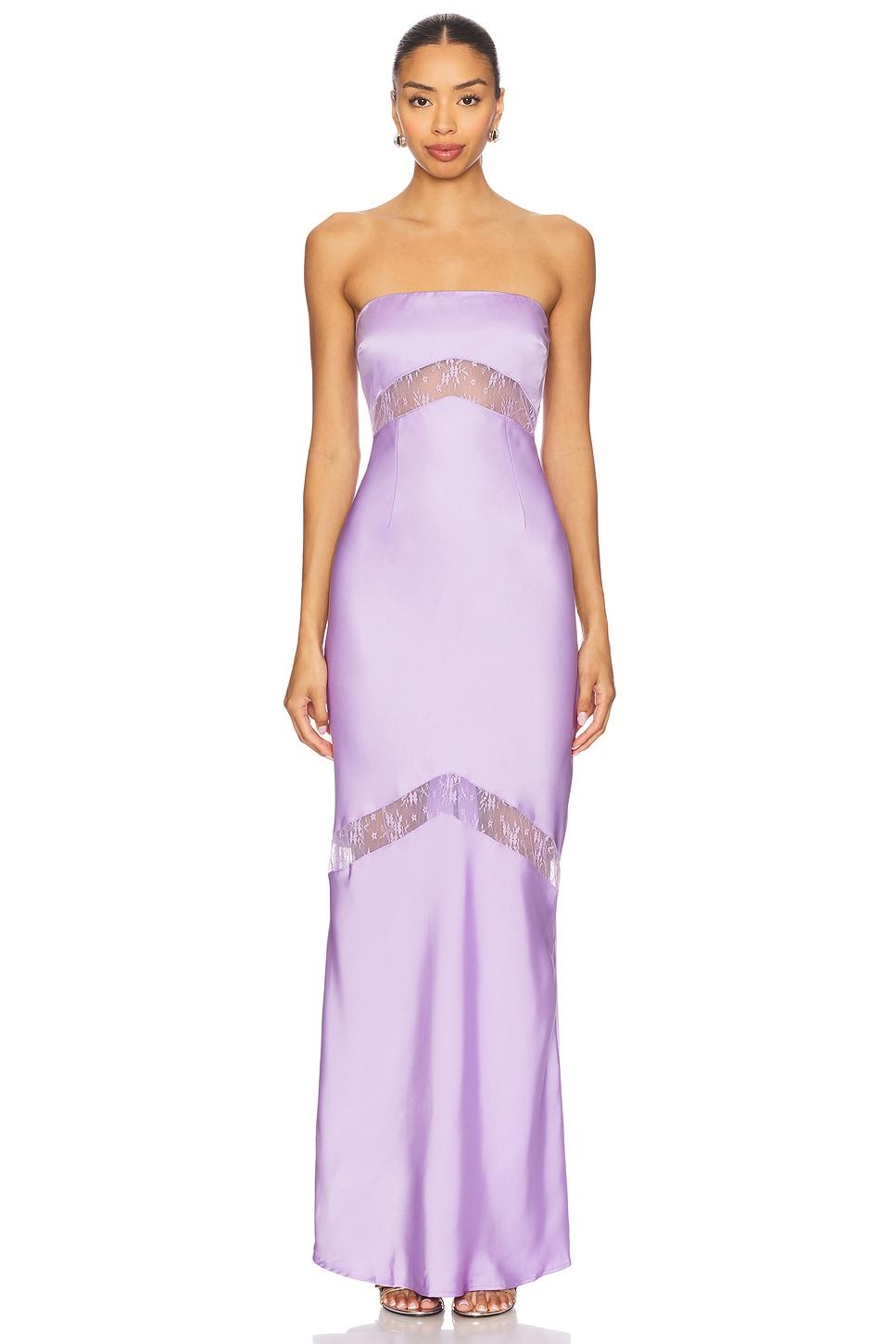 Self: 97% polyester, 3% spandexContrast Fabric: 90% nylon, 10% spandex. Hand wash cold. Unlined. Hidden back zip closure. Strapless design with nonstick silicone trim. Midweight satin fabric with sheer lace accents. Garment has intentionally sheer accents. Neckline to hem measures approx 55" in length. Made in China. Revolve Style No. RUNR-WD182. Manufacturer Style No. RN23-5148.