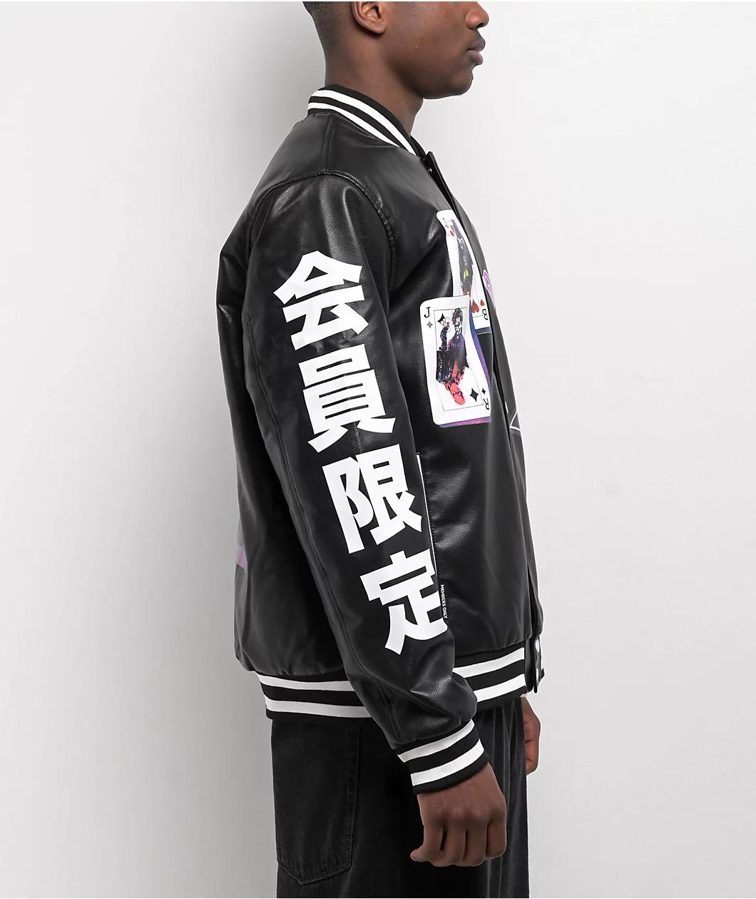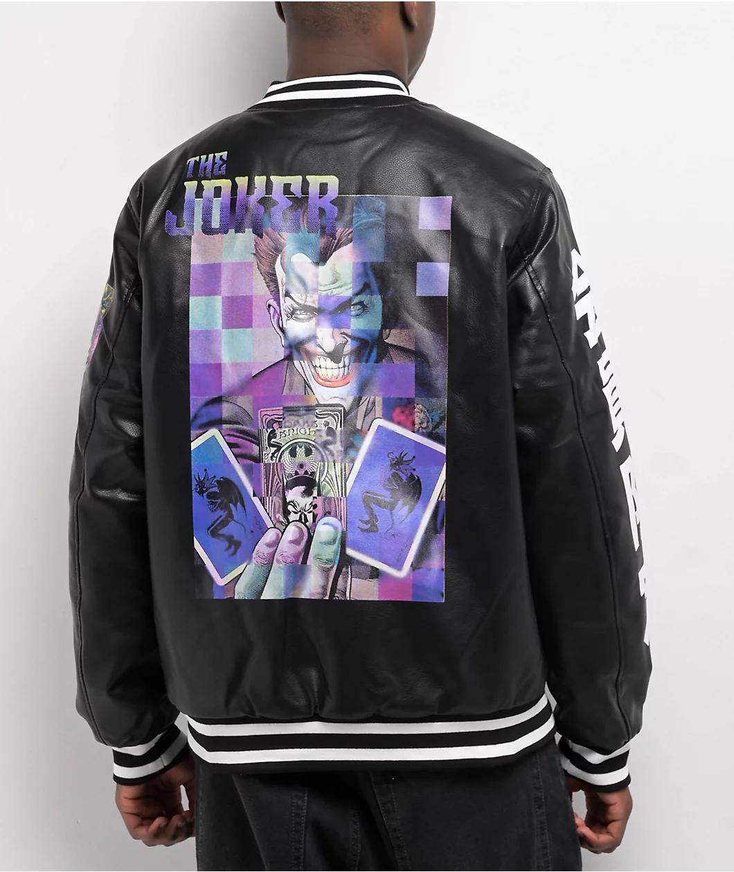 Fans of iconic Batman villain the Joker will love the vegan leather varsity jacket from Members Only. The warm coat features a full button up closure, and printed graphics throughout of the clown prince of crime alongside other Batman characters such