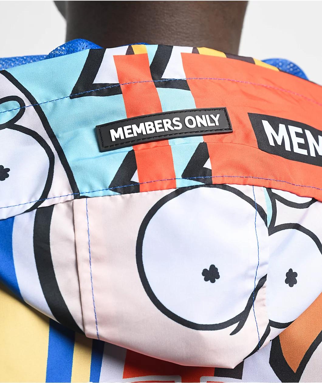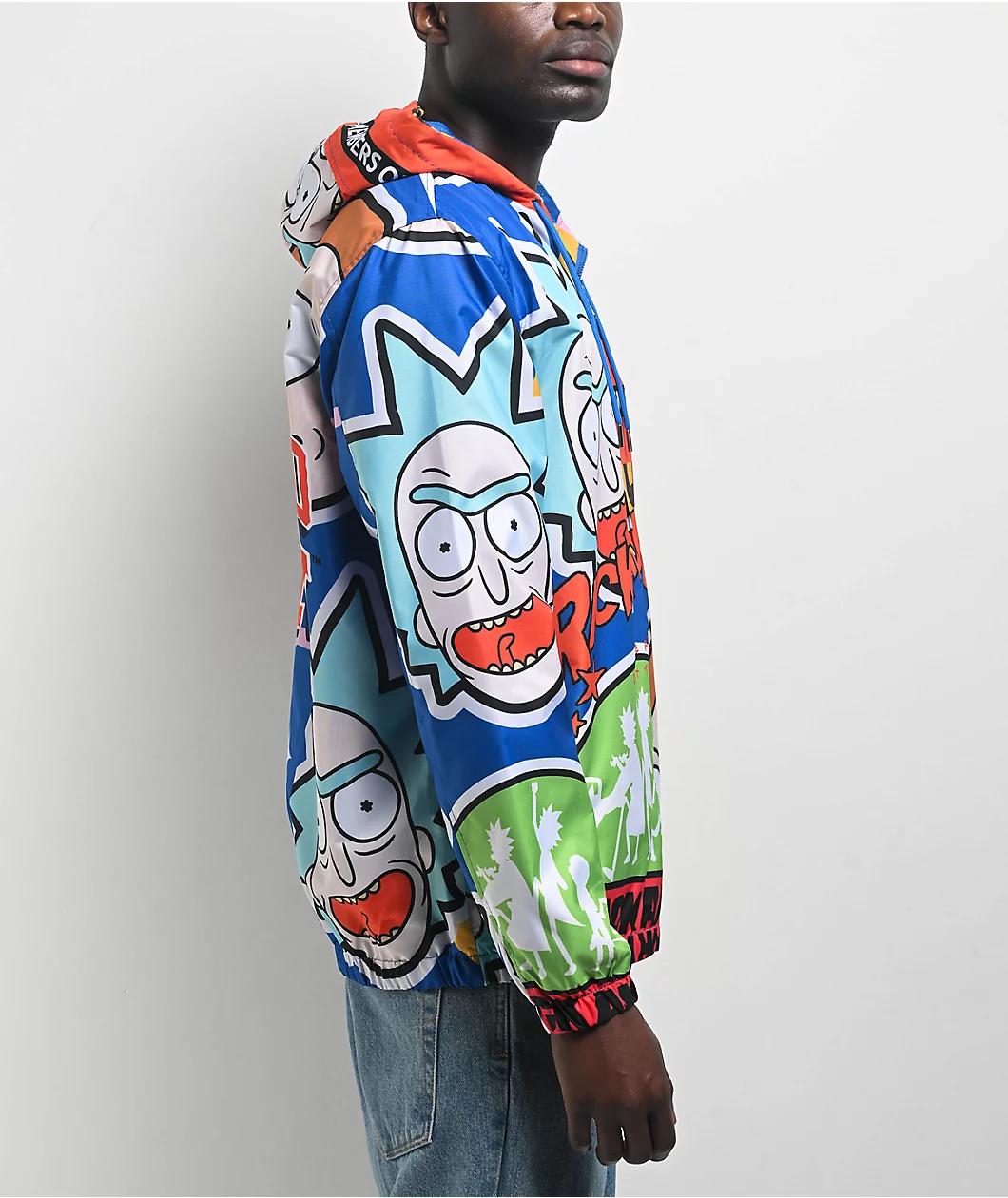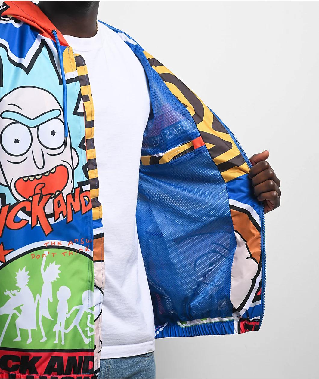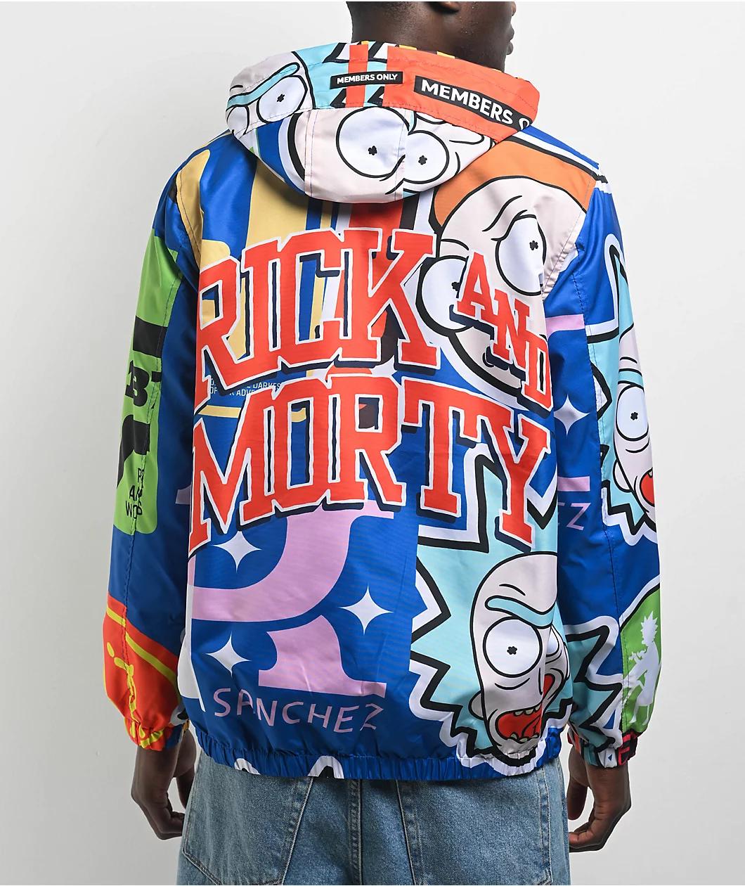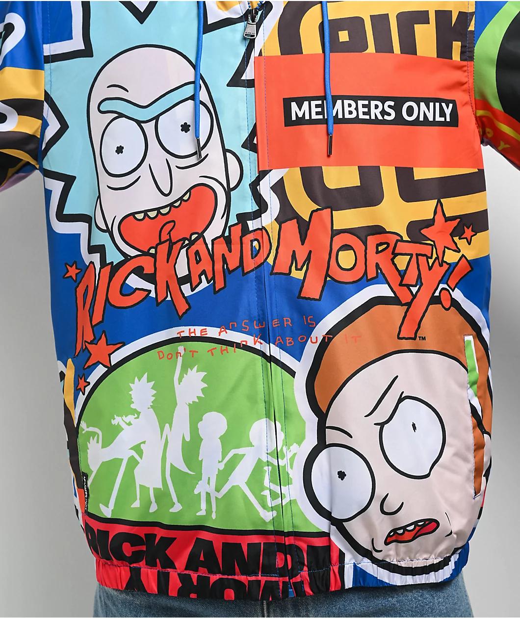 Stay dry in eye-catching style with the official collaboration windbreaker jacket from Members Only and acclaimed TV show Rick and Morty. The colorful coat features graphics throughout of imagery from the show, including orange "Rick and Morty" text
