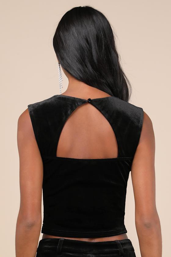 Dressing for the event just got easier, thanks to the Lulus Memorably Flirty Black Velvet Cropped Cutout Sleeveless Top! Plush, stretchy velvet shapes this chic top that has tapered straps and a cutout back with a loop-button closure at the top. Bodice has a square neckline and a seamed, corset-inspired silhouette that ends at a cropped hem. Hidden zipper at side.