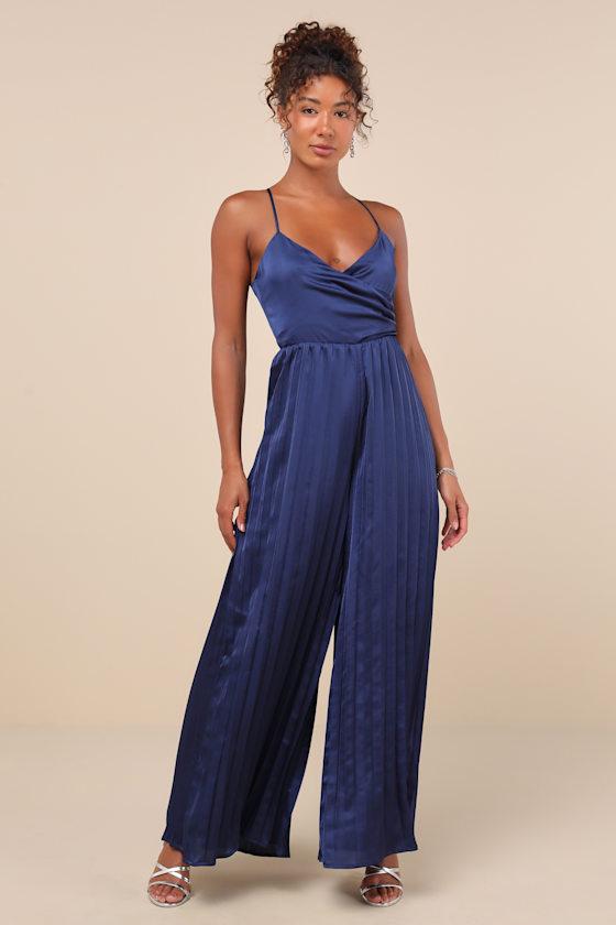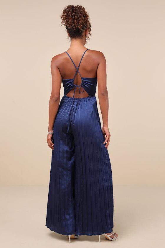 Everyone will be talking about the chic cutie in the Lulus Memorably Sophisticated Navy Satin Pleated Backless Jumpsuit! Lightweight woven satin shapes this elevated jumpsuit with slender spaghetti straps that lace up the open back, supporting a surplice bodice with subtle side pleating. Fitted waist tops wide, pleated legs that end at full-length hems. Elastic at back for fit.