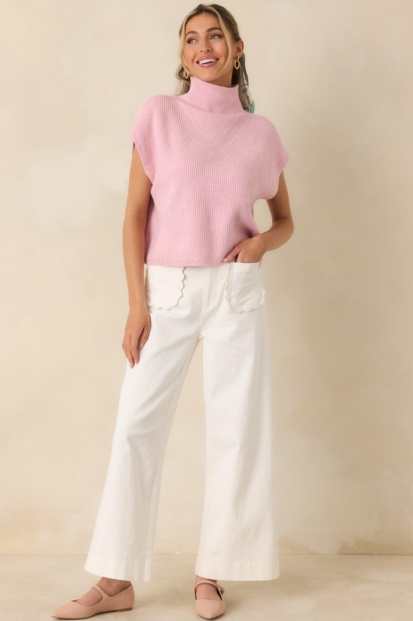 Cool Intentions Light Pink Ribbed Knit Mockneck Cap Sleeve Sweater captures that effortless, refined feeling that makes an outfit feel instantly complete. The light pink shade brings a soft, feminine feel to the clean lines, while the subtle texture adds just enough interest. It’s polished without being fussy and feels right for both dressed-up days and easy everyday moments. This light pink sweater is made from a ribbed knit fabric and features a mock neckline with cap sleeves. Designed with a relaxed yet refined fit, it includes subtle knit detailing at the chest and a clean hemline for a smooth finish. The sleeveless silhouette makes it ideal for layering or wearing on its own during transitional seasons.70% Polyester, 18% Acrylic, & 12% NylonUnlined Hand Wash Cold Manufactured in China Designed in The USAModel is 5'8" and Wearing a Size Small, Clipped, Model is a True X-Small