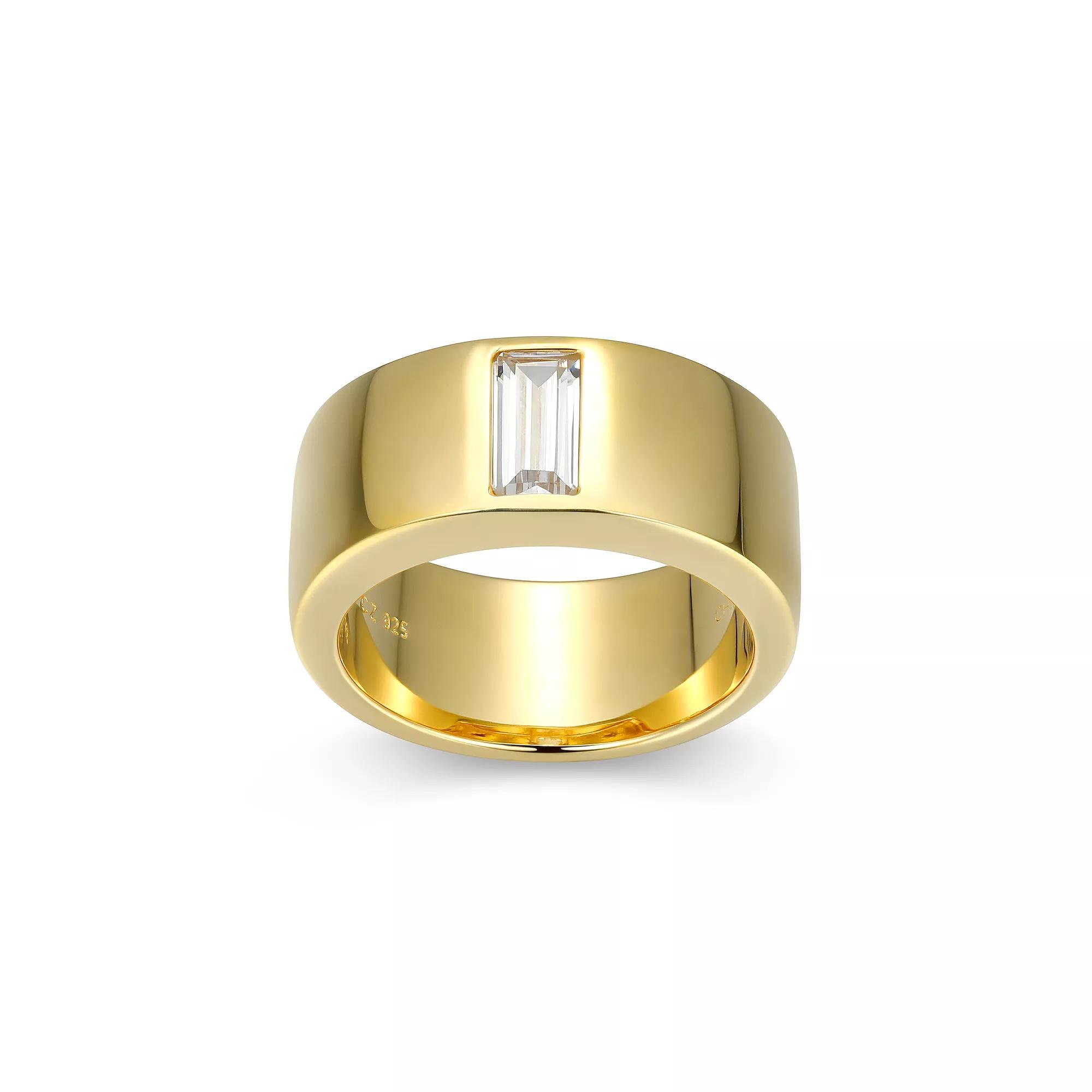 Capture classic elegance with this men’s 18k gold plated sterling silver solitaire ring, finished with a radiant cubic zirconia. It’s a bold piece with refined, everyday charm. Click on this JEWELRY & WATCHES GUIDE to learn about fit, styles, materials and more! Capture classic elegance with this men’s 18k gold plated sterling silver solitaire ring, finished with a radiant cubic zirconia. It’s a bold piece with refined, everyday charm. Click on this JEWELRY & WATCHES GUIDE to learn about fit, styles, materials and more! FEATURES Width: 4.06 mm Shank style: straight Band fit: comfort fit Nickel safe Metal: sterling silver Plating: 18k gold Finish: polished Packaging: boxedSTONE DETAILS Stone type: cubic zirconia Total weight: 1 ct. Center stone size: 8 mm x 4 mm Shape: baguette cut Setting: flush Gemstones may have been treated to enhance their appearance. Special care may be required. Please visit our Gemstone Treatment & Special Care Guide for more information. Size: 9. Color: Gold Tone. Gender: male. Age Group: adult. Material: Gold Over Sterling.