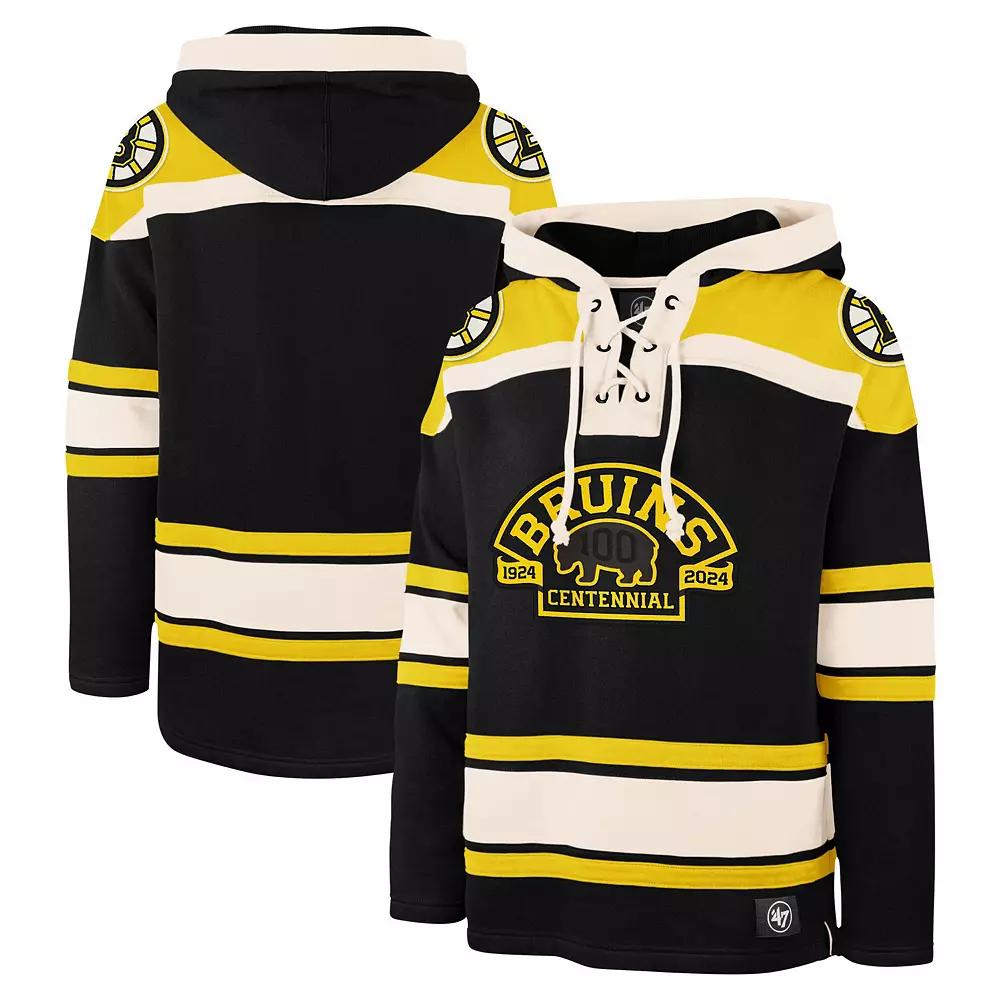 Rep your Boston Bruins during each game of their centennial season with this Superior Lacer hoodie from 47. It features vintage graphics that pay homage to the franchises storied history. Plus, its stylish lace-up neckline and sewn-on stripes accent the bold look thats just as grand as the past 100 years of Boston Bruins hockey.Rep your Boston Bruins during each game of their centennial season with this Superior Lacer hoodie from 47. It features vintage graphics that pay homage to the franchises storied history. Plus, its stylish lace-up neckline and sewn-on stripes accent the bold look thats just as grand as the past 100 years of Boston Bruins hockey.PRODUCT FEATURESFleece liningMachine wash, tumble dry lowOfficially licensedSewn-on fabric appliques with embroidered detailsHoodedMaterial: 80% Cotton/20% PolyesterLong sleeveBrand: 47Contrast-color stripesPulloverImportedRounded droptail hem with side splitsLace-up neckline with metal grommetsMidweight hoodie suitable for moderate temperatures Size: 2XL. Color: BSB BLACK. Gender: male. Age Group: adult.