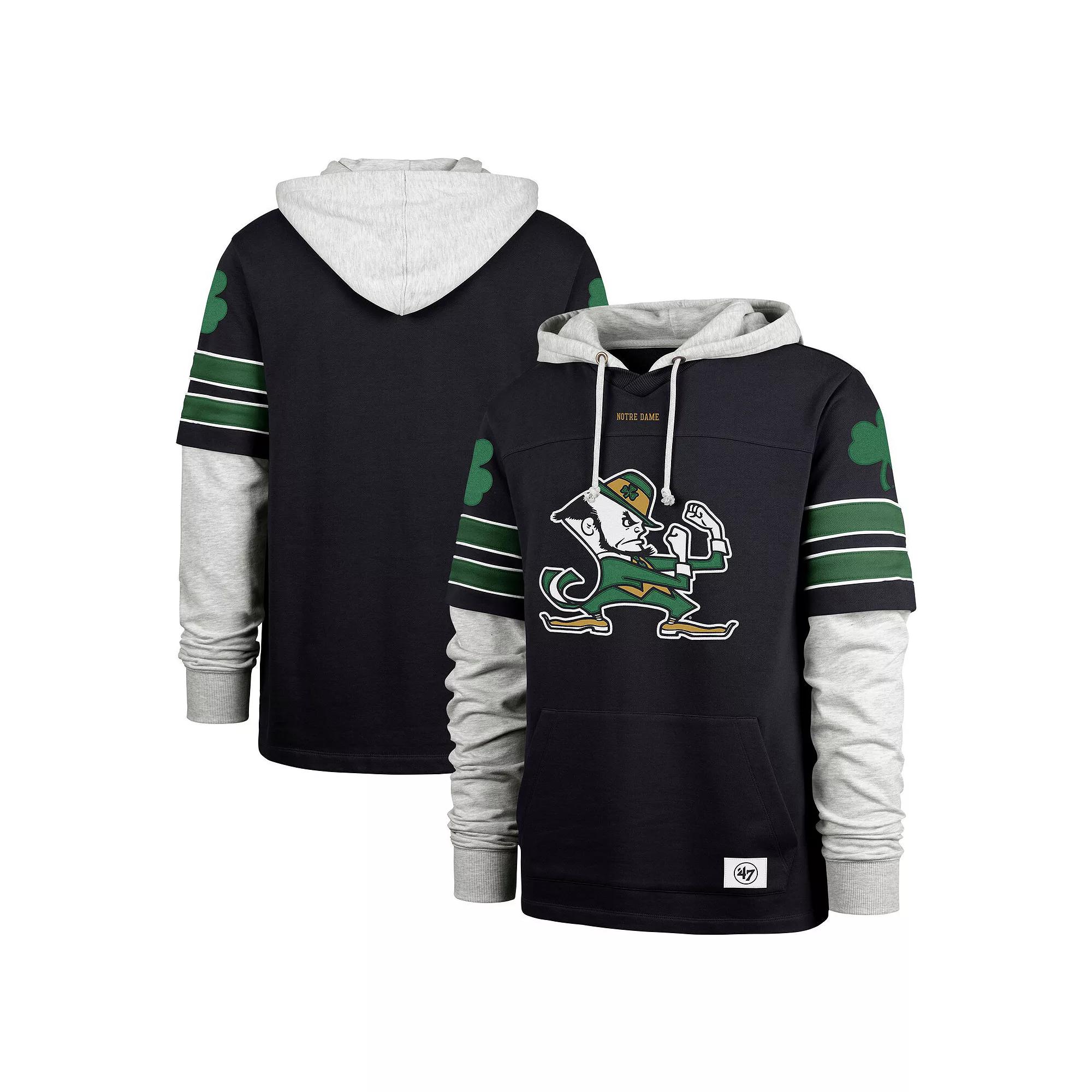 Stay warm while cheering on the Notre Dame Fighting Irish with this '47 Big & Tall Blitz Lacer Pullover Hoodie. This pullover hoodie features contrast-color stripes and embroidered applique graphics, including a bold wordmark across the torso, for a spirited look that makes your Notre Dame Fighting Irish pride unmistakable. This midweight hoodie's fleece lining offers incredible softness to keep you comfortable whether you're cheering from the stands on a crisp autumn day or relaxing at home.Stay warm while cheering on the Notre Dame Fighting Irish with this '47 Big & Tall Blitz Lacer Pullover Hoodie. This pullover hoodie features contrast-color stripes and embroidered applique graphics, including a bold wordmark across the torso, for a spirited look that makes your Notre Dame Fighting Irish pride unmistakable. This midweight hoodie's fleece lining offers incredible softness to keep you comfortable whether you're cheering from the stands on a crisp autumn day or relaxing at home.PRODUCT FEATURESFleece liningContrast-color stripesSide splits at hemMachine wash, tumble dry lowEmbroidered fabric applique team logosLong sleeveMidweight hoodie suitable for moderate temperaturesHoodedBrand: '47PulloverImportedFront pouch pocketEmbroidered wordmark below necklineOfficially licensedMaterial: 60% Cotton/40% Polyester Size: 3XLT. Color: Navy. Gender: male. Age Group: adult.