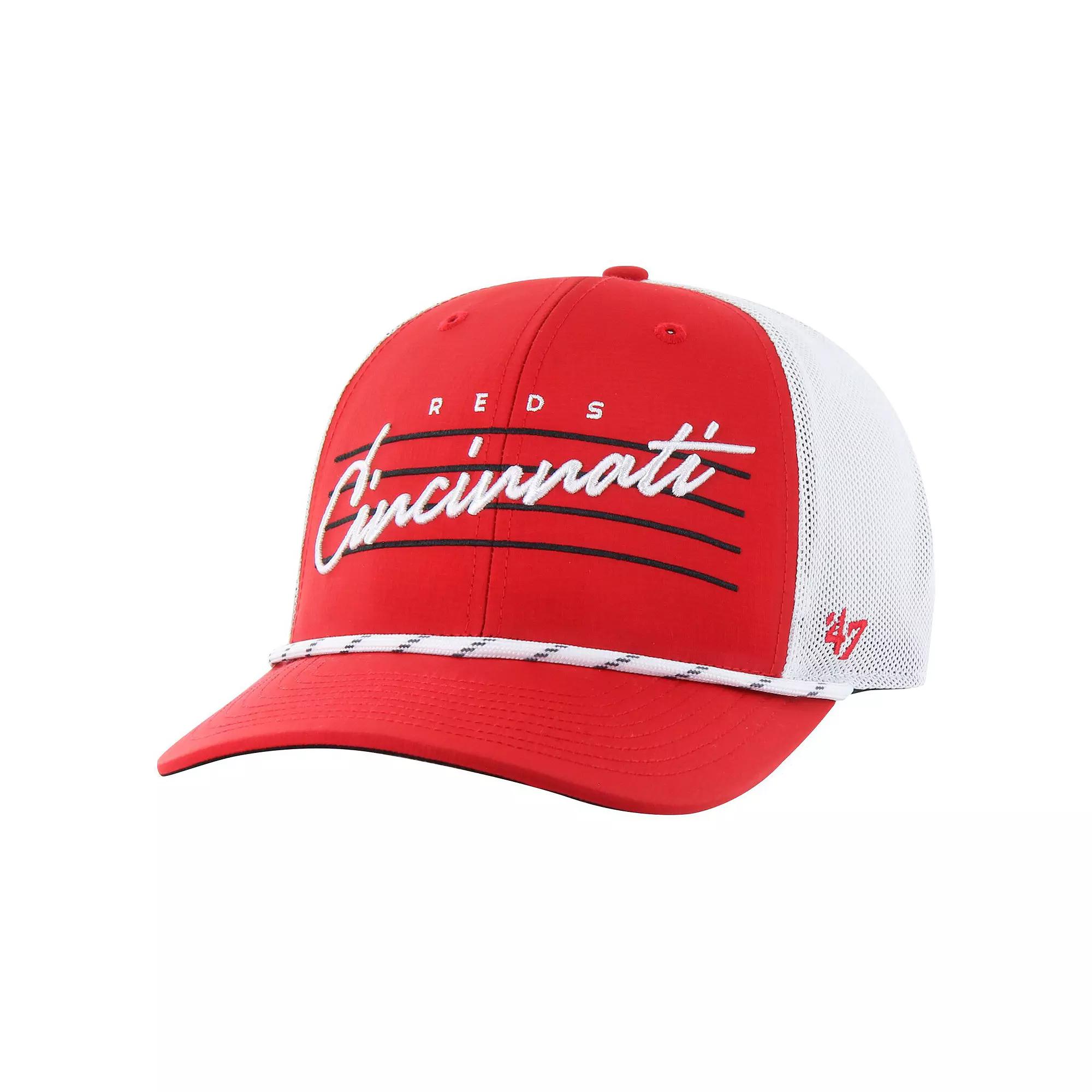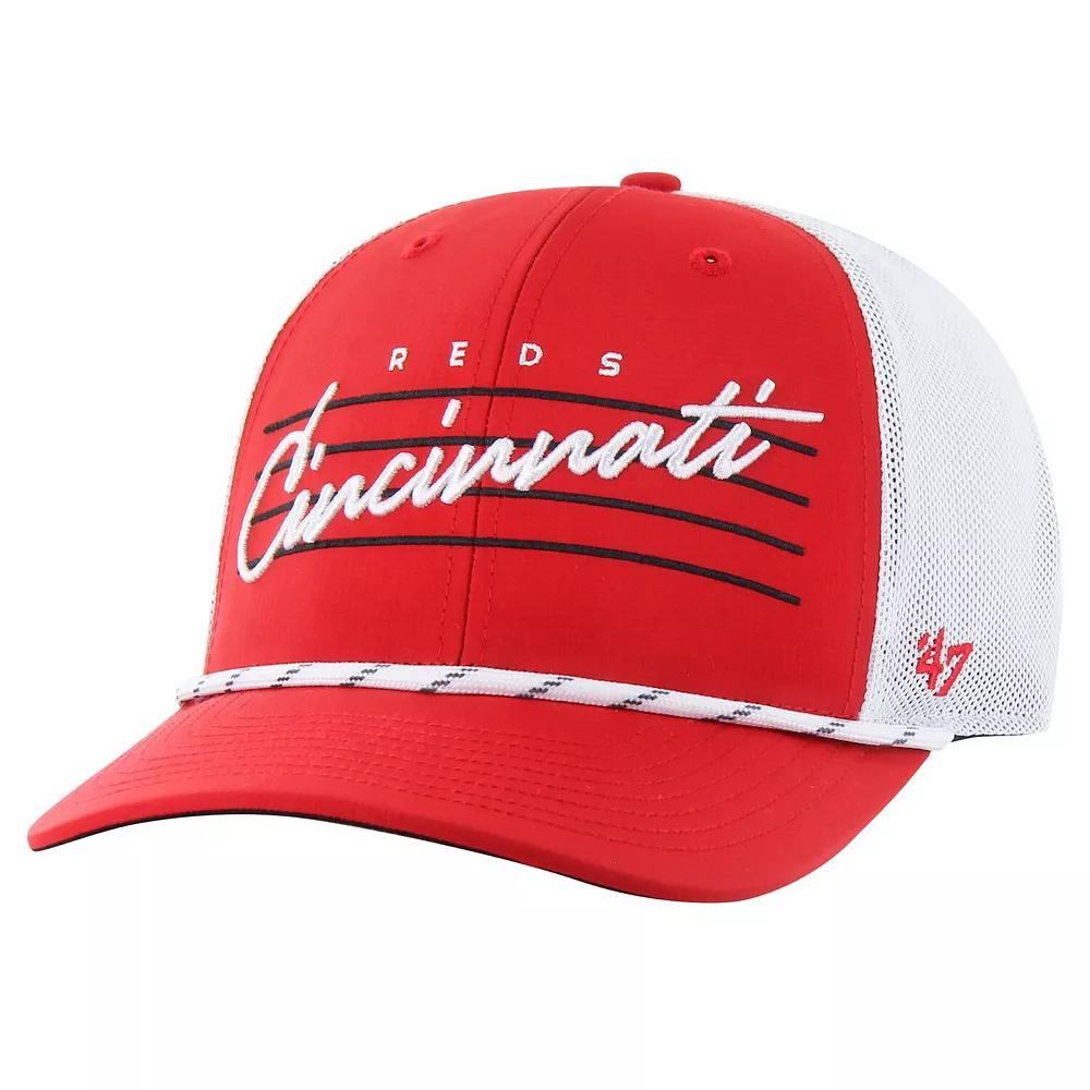 Show off your Cincinnati Reds pride with this '47 Downburst Trucker Adjustable Hat. This stylish hat features the Cincinnati Reds name embroidered in raised detail across music scale lines on the front, adding a unique and eye-catching element to your game day look. With two solid front panels and four mesh mid and rear panels, this hat provides optimal breathability and comfort.Show off your Cincinnati Reds pride with this '47 Downburst Trucker Adjustable Hat. This stylish hat features the Cincinnati Reds name embroidered in raised detail across music scale lines on the front, adding a unique and eye-catching element to your game day look. With two solid front panels and four mesh mid and rear panels, this hat provides optimal breathability and comfort.PRODUCT FEATURESWipe clean with a damp clothOne size fits mostBrand: '47ImportedCurved billMid CrownMaterial: 100% NylonBlack undervisorSnap ClosureTeam name embroidered in raised details across music scale lines on the frontStructured fitWoven team clip tag on backDecorative rope embellishment on visorFour mesh mid and rear panelsTwo solid front panels with eyeletsOfficially licensed Size: One Size. Color: Red Red. Gender: male. Age Group: adult.