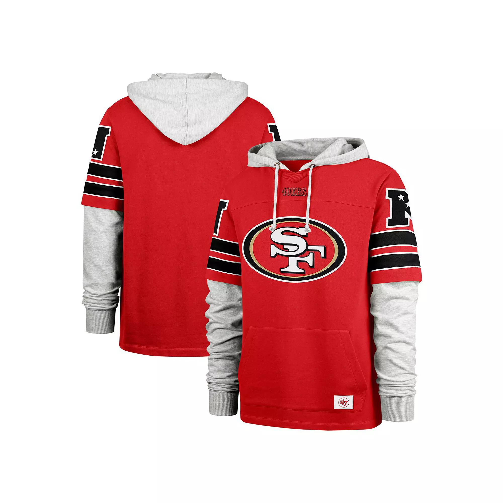 Show off your San Francisco 49ers pride with this comfortable Double Header Blitz Cornerback Pullover Hoodie from '47. This stylish hoodie features a team logo fabric applique on the front and conference patch appliques on both shoulders for bold displays of San Francisco 49ers pride. The fleece lining and midweight design make it perfect for moderate temperatures, ensuring cozy comfort whether you're cheering from the stands or watching the game from home.Show off your San Francisco 49ers pride with this comfortable Double Header Blitz Cornerback Pullover Hoodie from '47. This stylish hoodie features a team logo fabric applique on the front and conference patch appliques on both shoulders for bold displays of San Francisco 49ers pride. The fleece lining and midweight design make it perfect for moderate temperatures, ensuring cozy comfort whether you're cheering from the stands or watching the game from home.PRODUCT FEATURESLong sleeveHoodedMachine wash, tumble dry lowOfficially licensedPulloverFront pouch pocketMaterial: 60% Cotton/40% PolyesterRib-knit cuffsConference patch appliques on both shouldersBrand: '47Sewn-on sleeve stripesMidweight hoodie suitable for moderate temperaturesFleece liningFaux short sleevesImportedTeam logo fabric applique on front center chest Size: XL. Color: Red. Gender: male. Age Group: adult.