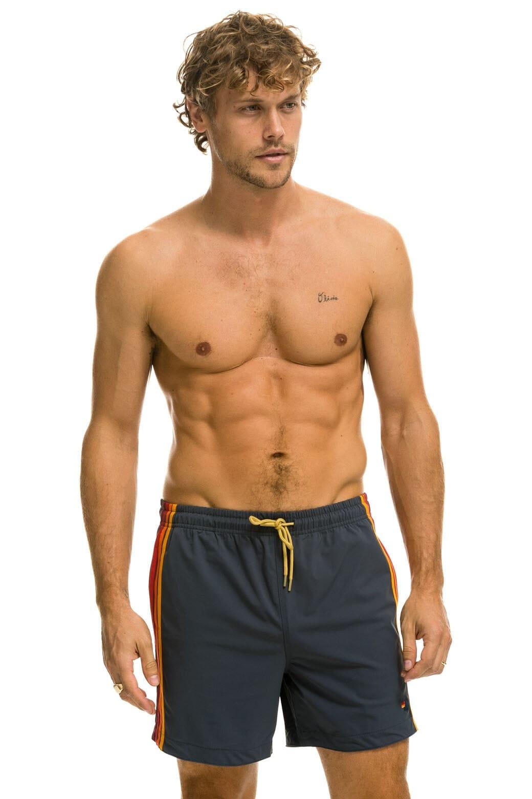 Rock the classic Aviator Nation look with our stripe stitch down the leg of these shorts! These super breathable board shorts are great for all water activities as well as lounge wear with deep twin hip pockets and the perfect amount of stretch. - Model is wearing a size 32 - Hand stitched in LA with imported fabric - 79% Polyamide + 21% Lycra - Machine wash cold with like colors. Hang or tumble dry on low.