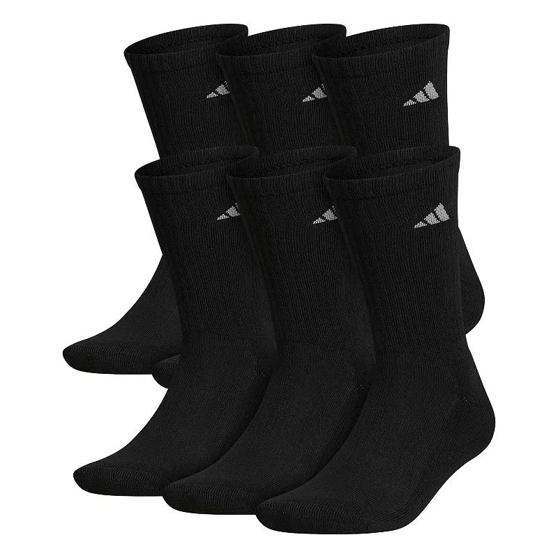 adidas socks do it all. These men's performance socks are a must-have for your active lifestyle.adidas socks do it all. These men's performance socks are a must-have for your active lifestyle.PRODUCT FEATURES 6-pack Crew-length cut hits at mid calf Moisture-wicking technology keeps feet dry and cool All-over cushioning supports high-impact areas Ribbing provides shape retentionFABRIC & CARE Polyester/spandex/natural latex Machine wash Imported Size: 5-8. Color: Black. Gender: male. Age Group: adult. Pattern: solid.