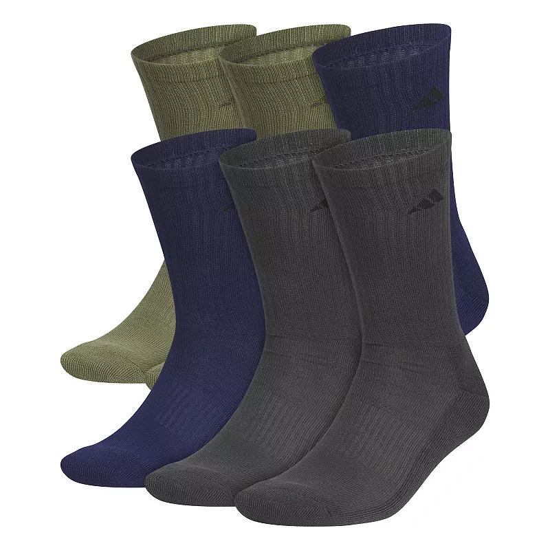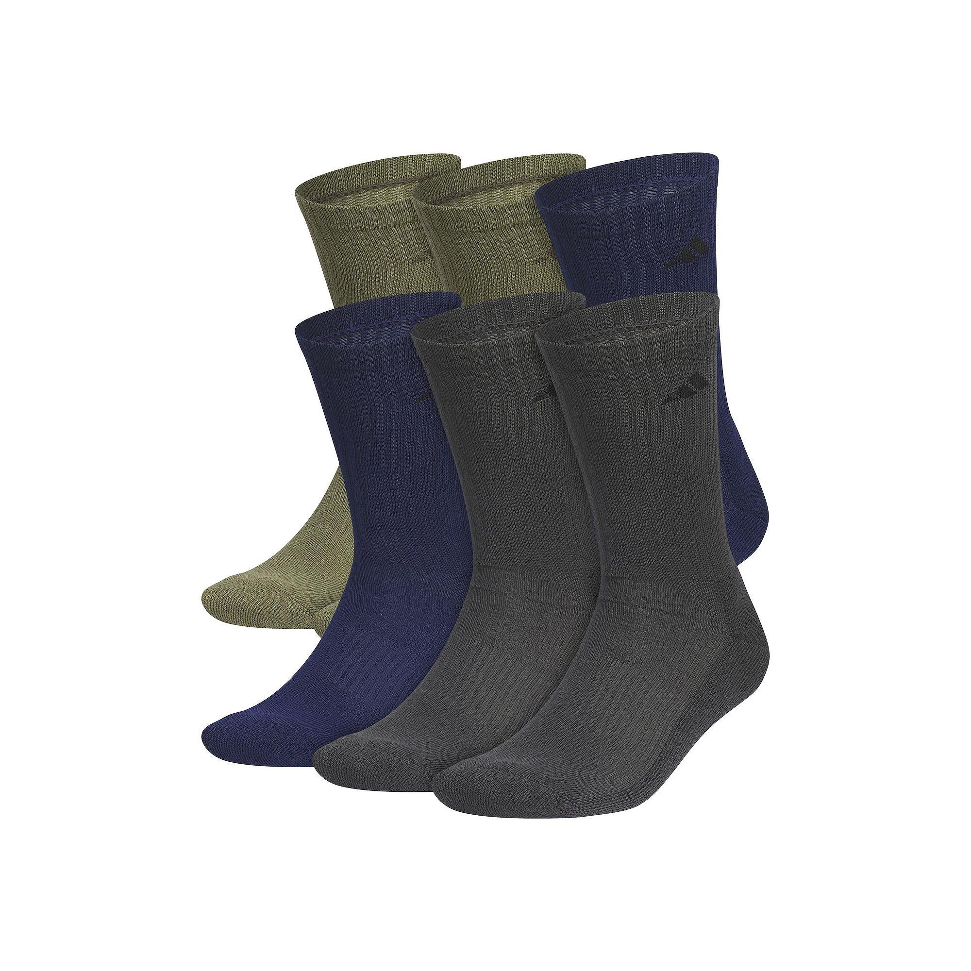 adidas socks do it all. These mens performance socks are a must-have for your active lifestyle.adidas socks do it all. These mens performance socks are a must-have for your active lifestyle.PRODUCT FEATURES 6-pack Crew-length cut hits at mid calf Moisture-wicking technology keeps feet dry and cool All-over cushioning supports high-impact areas Ribbing provides shape retentionFABRIC & CARE Polyester/spandex/natural latex Machine wash Imported Size: 8-12. Color: Olive Blue Grey. Gender: male. Age Group: adult. Pattern: solid.