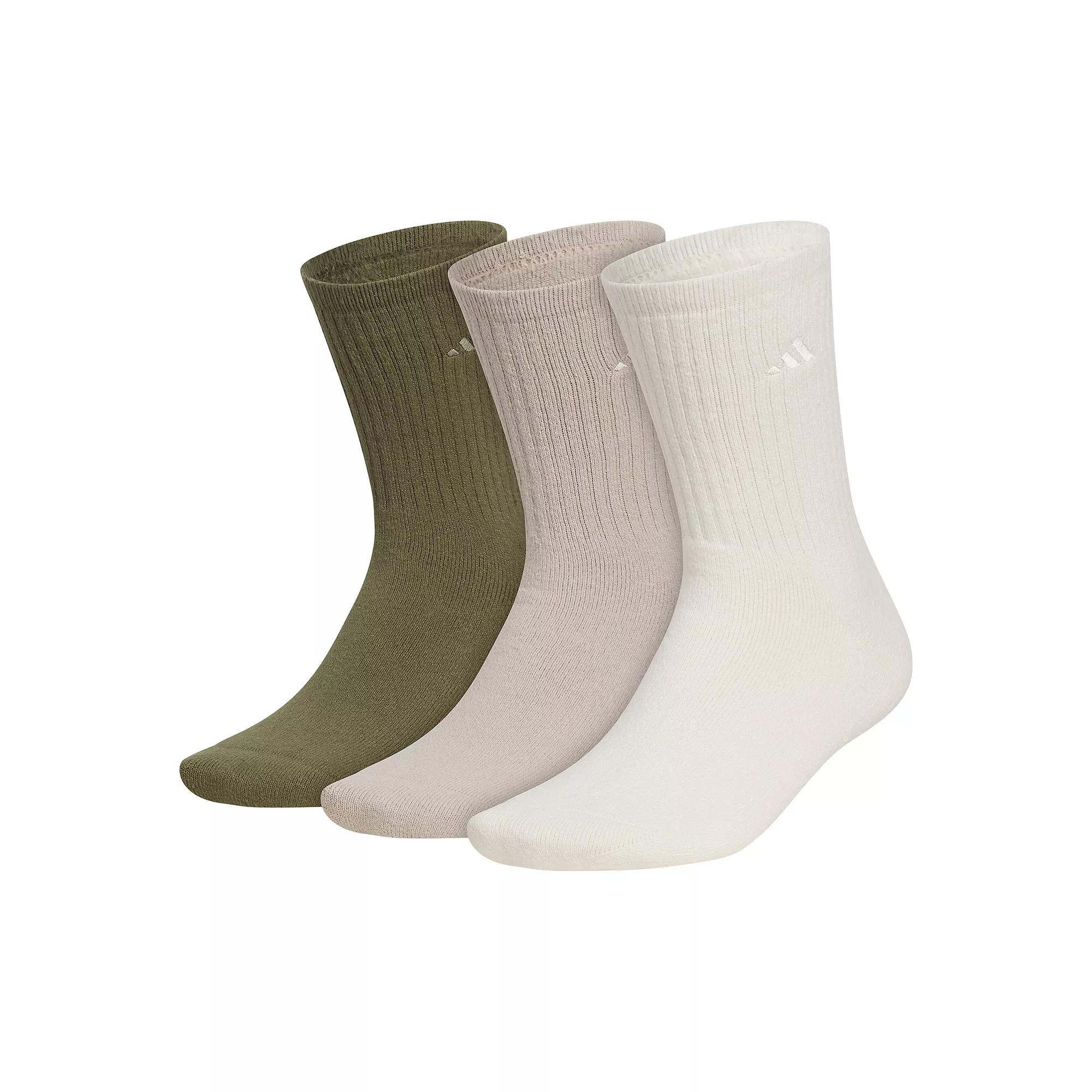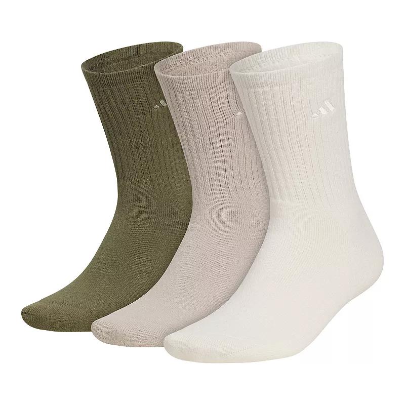 Show your feet some love in these adidas crew-length socks. The three-pack includes super soft yarns with three different colored socks, all with embroidered branding. A full cushioned leg and footbed provide all-day comfort. Show your feet some love in these adidas crew-length socks. The three-pack includes super soft yarns with three different colored socks, all with embroidered branding. A full cushioned leg and footbed provide all-day comfort. FEATURES Super soft polyester yarn Fully cushioned leg and foot for maximum comfort Three different colors in one packFIT & SIZING 3 pairs Crew socksFABRIC & CARE Polyester, natural latex rubber, spandex Machine wash Imported Size: 6-12. Color: Olive Beige. Gender: male. Age Group: adult.