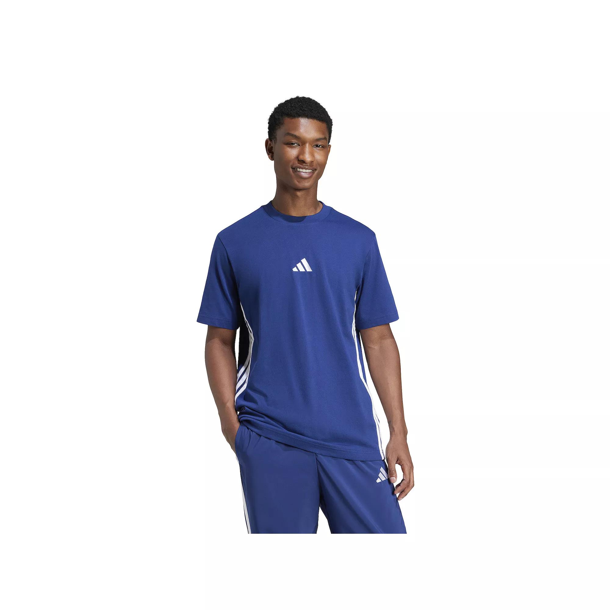 Introducing the Essential Three Stripes Single Jersey Tee, a staple for any man's wardrobe. This regular fit, knit t-shirt, made with recycled and renewable materials, offers a modern design with clean, versatile styles for an easy, everyday look. With updated fits, fabrics, and branding, this tee features bold three stripes and an embroidered logo, embodying the spirit of adidas sportswear. A dropped shoulder and armhole design provide an improved fit for all-day comfort and style. Click on this MEN'S GUIDE to find the perfect fit and more! Introducing the Essential Three Stripes Single Jersey Tee, a staple for any man's wardrobe. This regular fit, knit t-shirt, made with recycled and renewable materials, offers a modern design with clean, versatile styles for an easy, everyday look. With updated fits, fabrics, and branding, this tee features bold three stripes and an embroidered logo, embodying the spirit of adidas sportswear. A dropped shoulder and armhole design provide an improved fit for all-day comfort and style. Click on this MEN'S GUIDE to find the perfect fit and more! TECHNOLOGIES & FEATURES Single jersey construction Rounded hem Crewneck Short sleevesFIT & SIZING 25" length Midrise sits above the hip Regular fit LightweightFABRIC & CARE 100% Cotton Machine wash Imported Size: XXL. Color: Dark Blue. Gender: male. Age Group: adult.