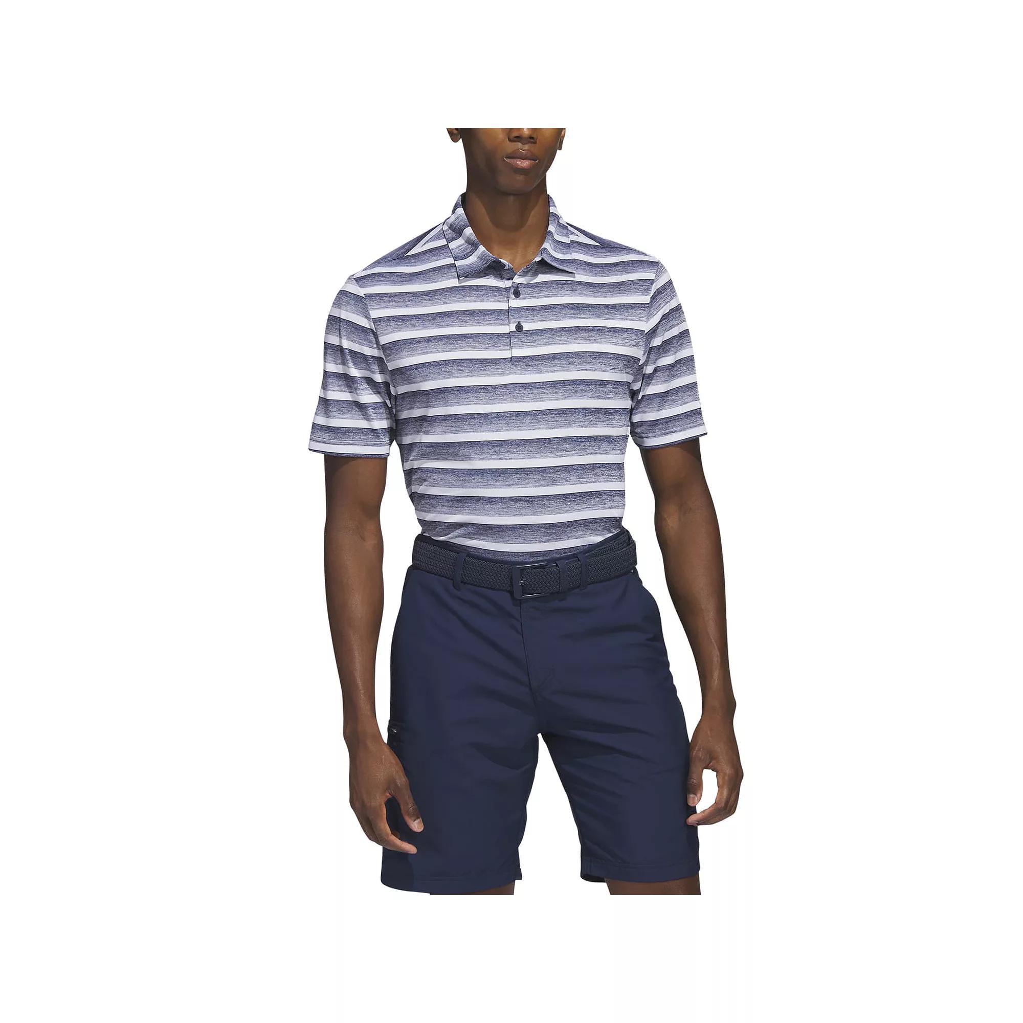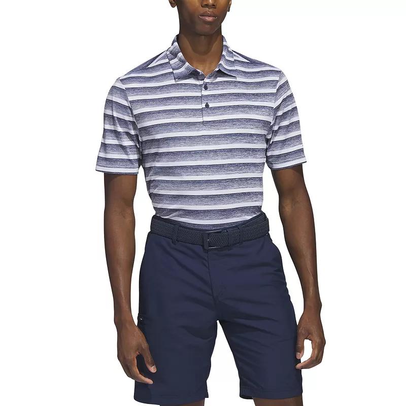 The primary materials that compose this product contain a minimum of 20 percent recycled content. ; Strike your best shot and pose as you flaunt away the adidas Golf Two-Color Stripe Polo T-shirt. Slim fit. Spread collar with a two-button placket. Upper front chest colorblock for added style. Short sleeves with adidas logo on left arm and a straight hemline. 100% recycled polyester. Machine wash, tumble dry. Imported. Measurements: Length: 31 in Sleeve Length: 10 in Product measurements were taken using size MD. Please note that measurements may vary by size.