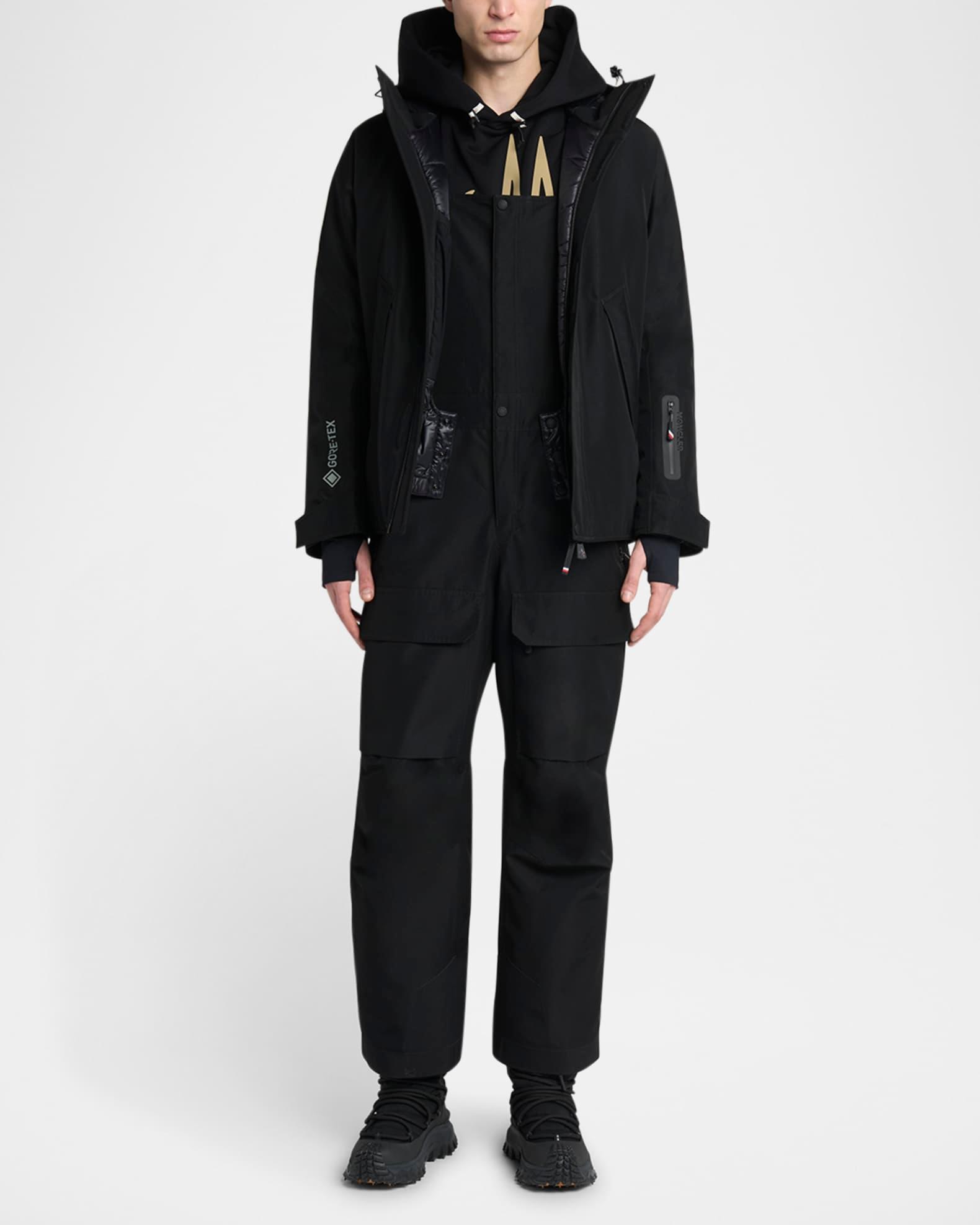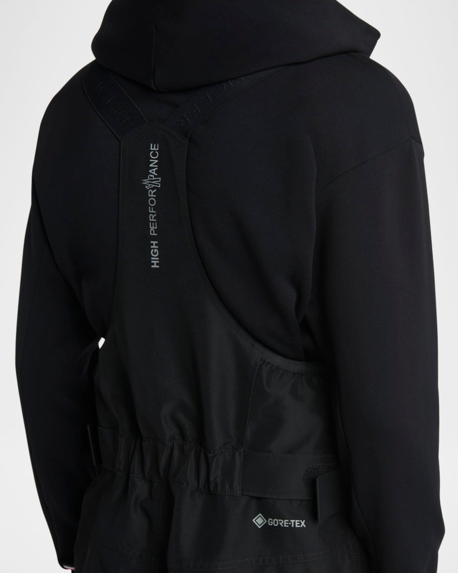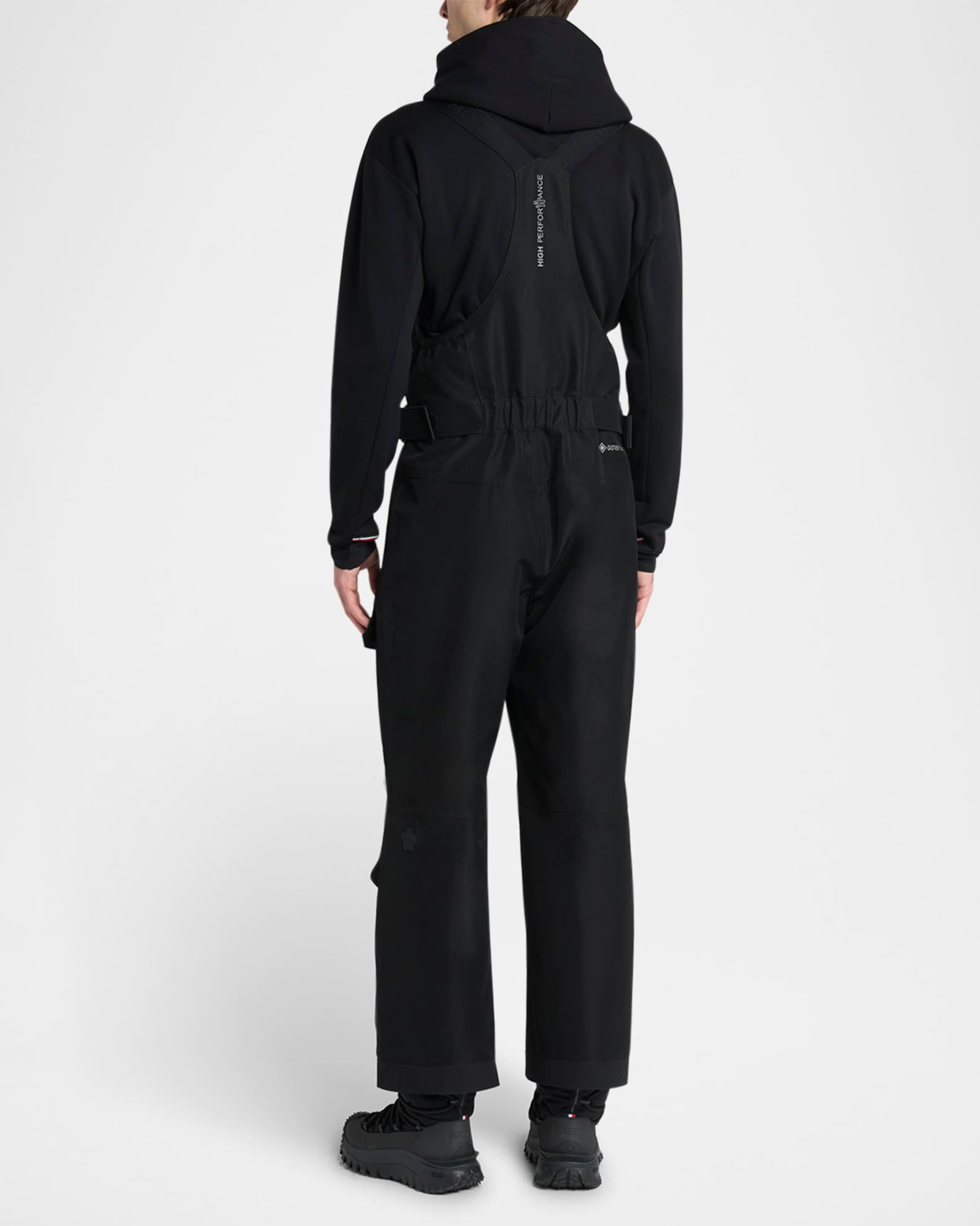 Move freely as you ski and rest assured, this Moncler Grenoble ski suit stays put with logo text suspenders and an adjustable belt at the waistline. Two-button front Adjustable suspenders Elasticized waist with belt Zip pockets; flap pockets above the knee Logo text and emblem at the back Straight legs Full length Polyester/nylon/polyamide Lining: Polyester/elastane/nylon Machine wash cold Imported