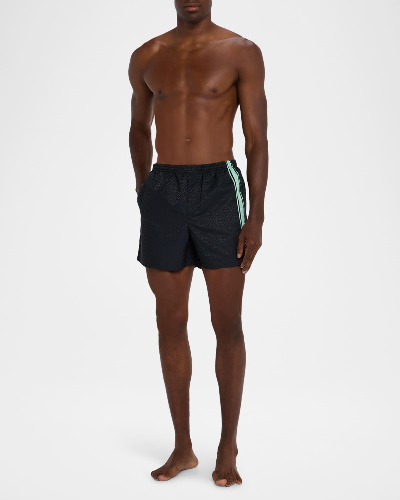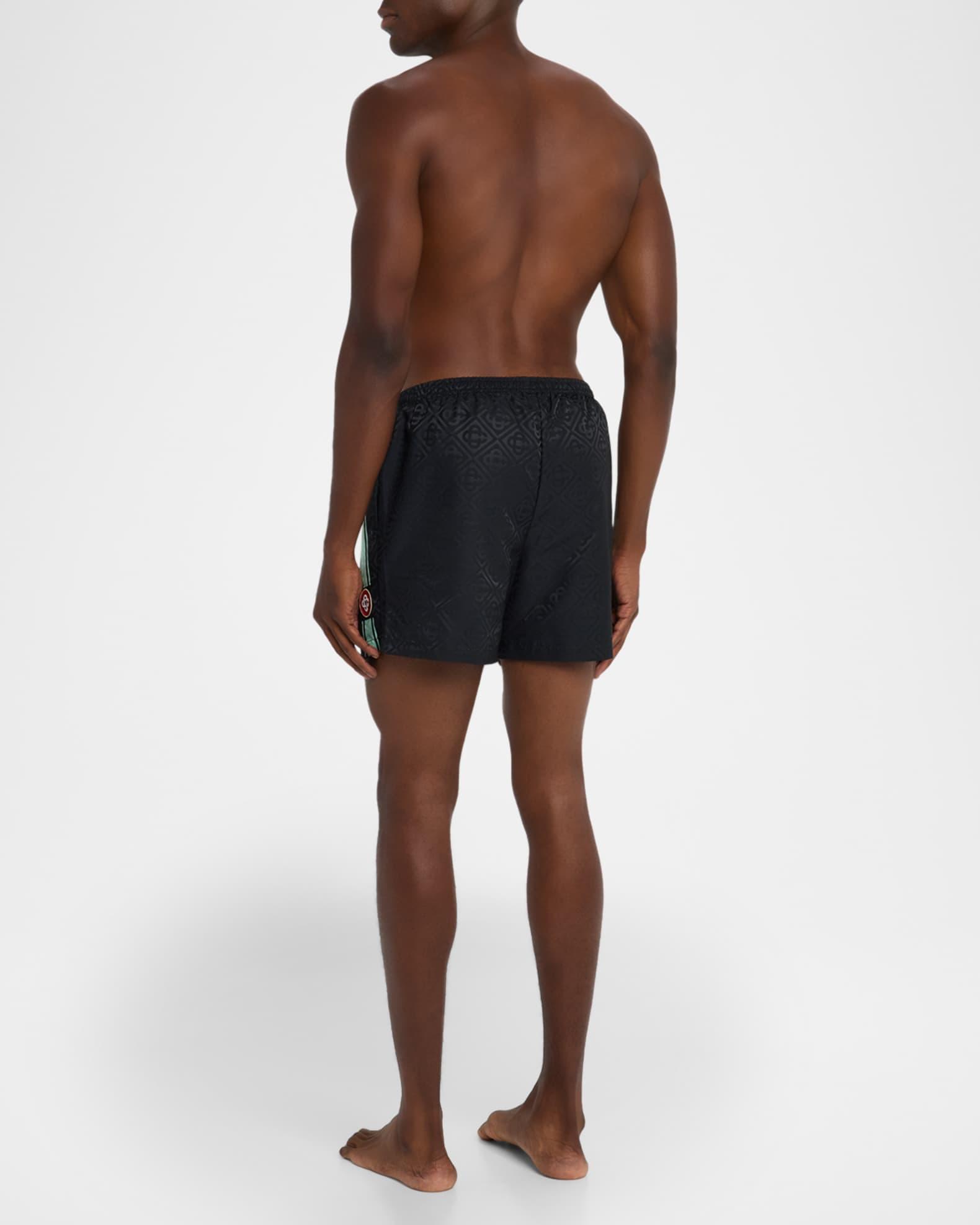 CASABLANCA swim shorts in discreet tonal monogram jacquard accented with vibrant side stripes Logo appliqué on the left leg Regular rise Side slip pockets Elasticized waistband Shorter leg Pull-on style Modern fit Polyester Lining: Polyester Machine wash cold Made in Portugal