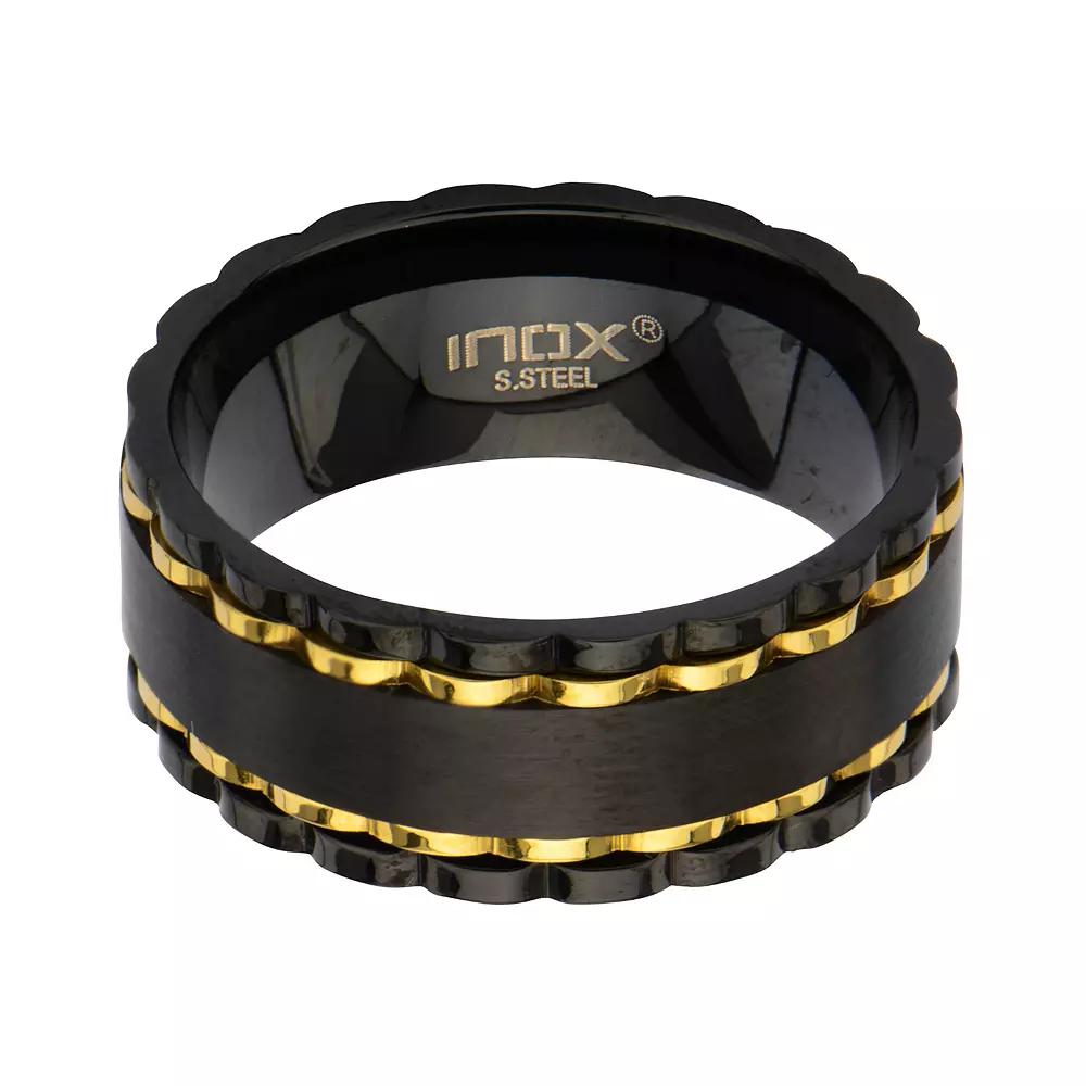 Make the perfect addition to your wardrobe with this men's alternative gold and black spinner ring. Width: 11.17 mm Base material: stainless steel Plating: ion Finish: polished Packaging: boxed Design: spinner Additional details: nickel free Color: Multicolor. Gender: male. Age Group: adult.