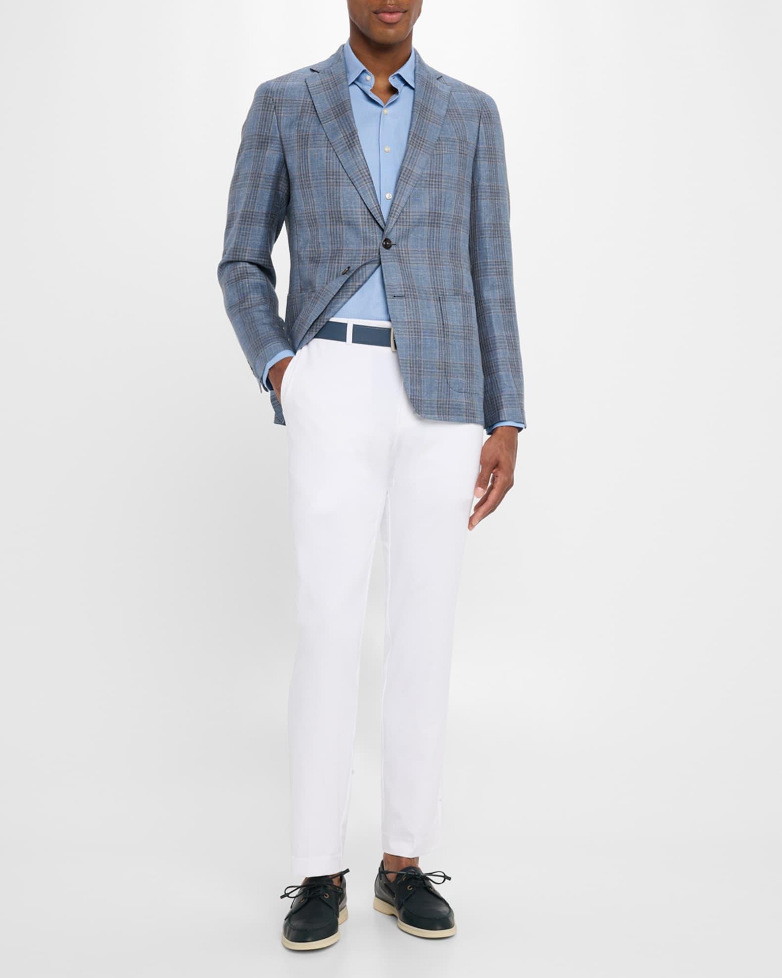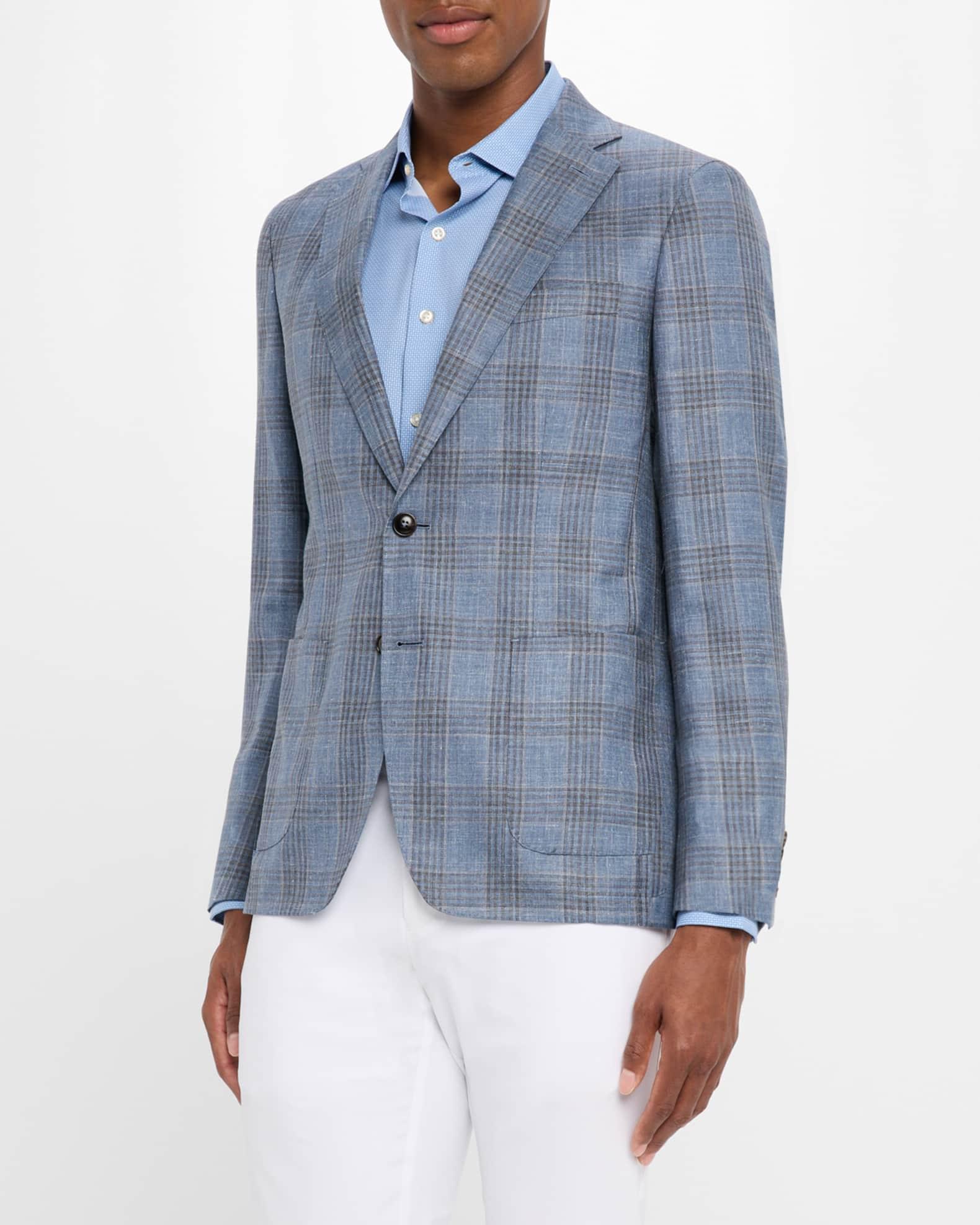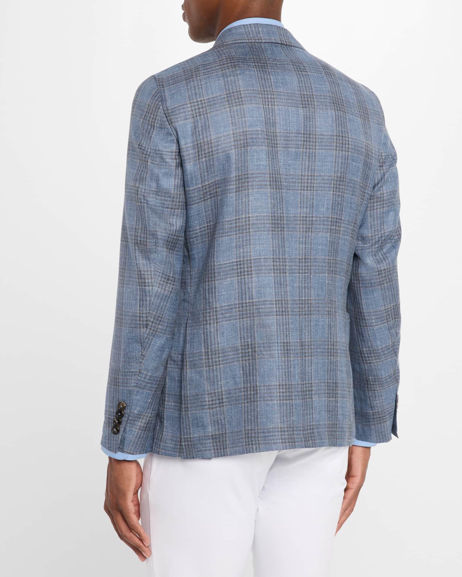 Peter Millar sport jacket crafted from a luxurious blend of wool and linen from Italy, with a subtle plaid pattern Notched lapels Hand-tacked lapel pin Single-breasted front Genuine Italian horn buttons Barchetta chest pocket Internal breast pocket Hip patch pockets Natural shoulder Basted sleeves Four-button cuffs Double-vented back Half-lined interior Tailored fit Wool/linen Unlined Dry clean Made in Romania