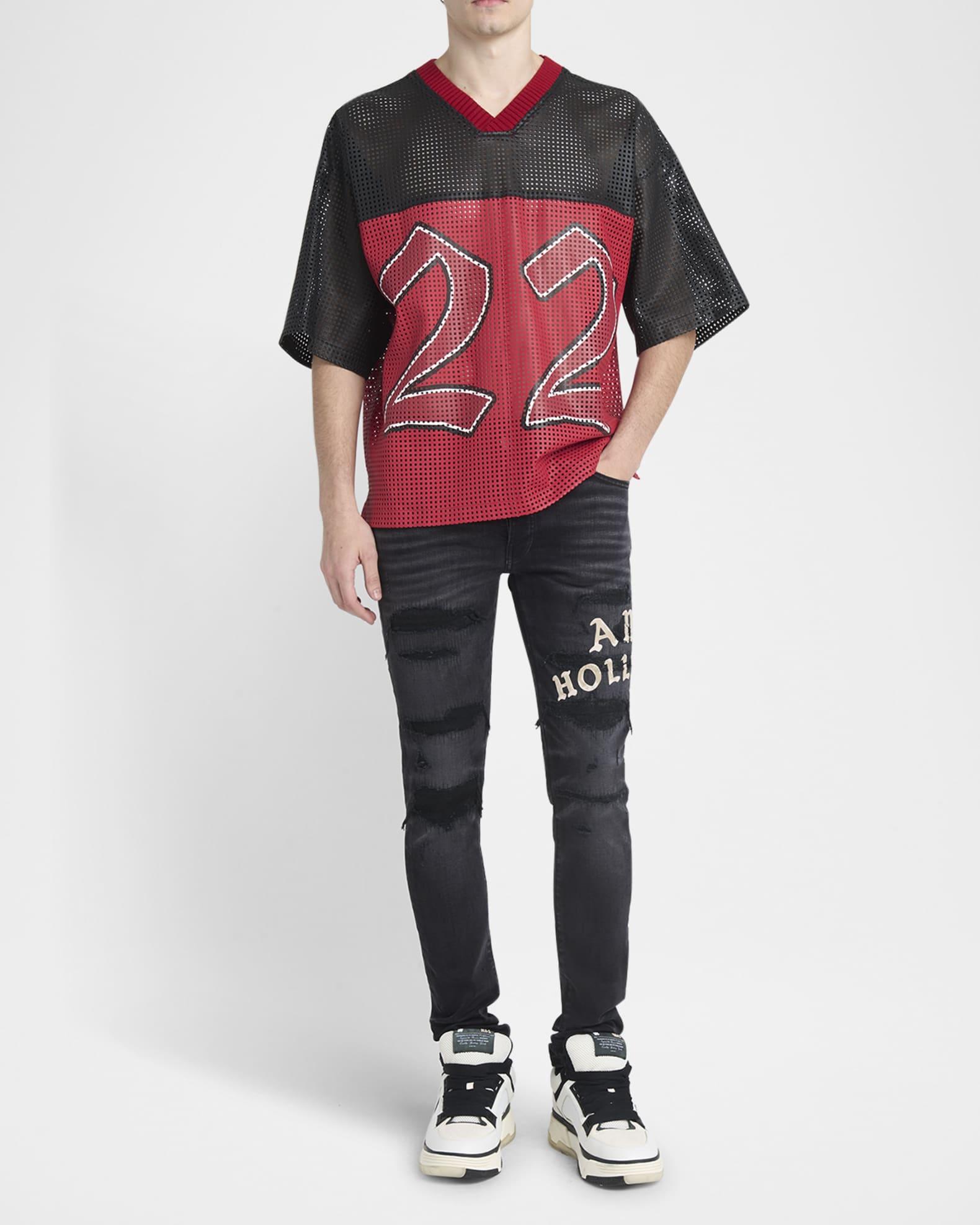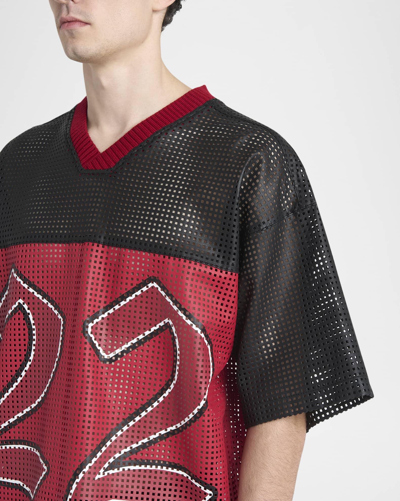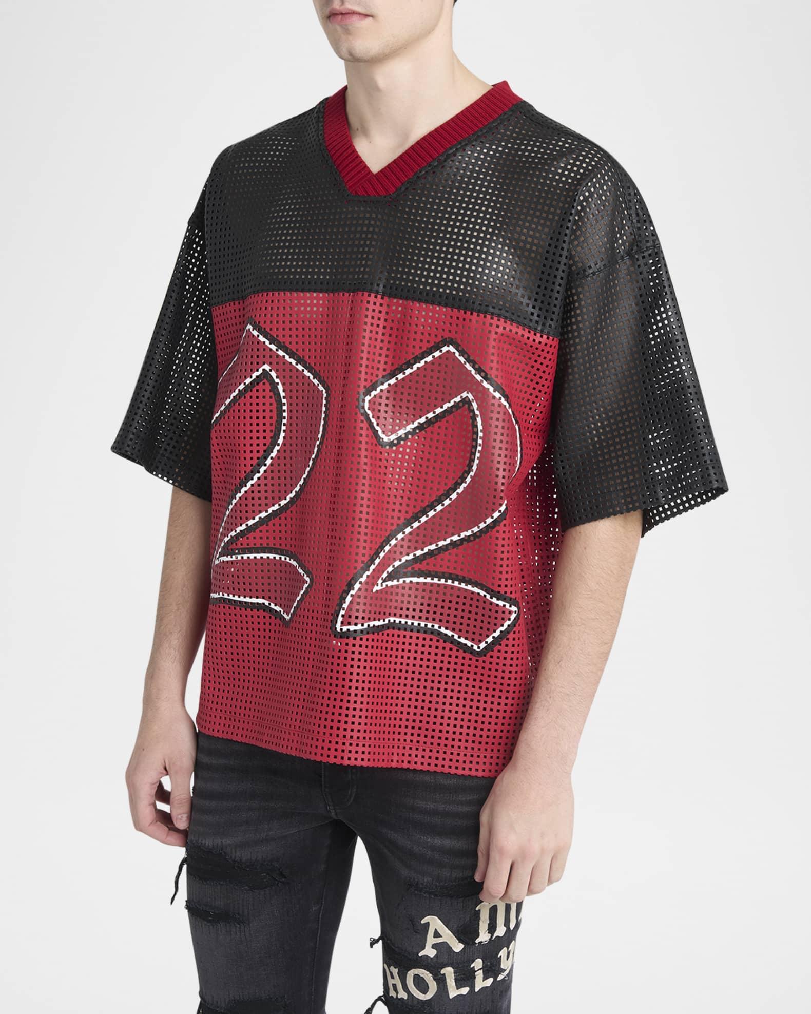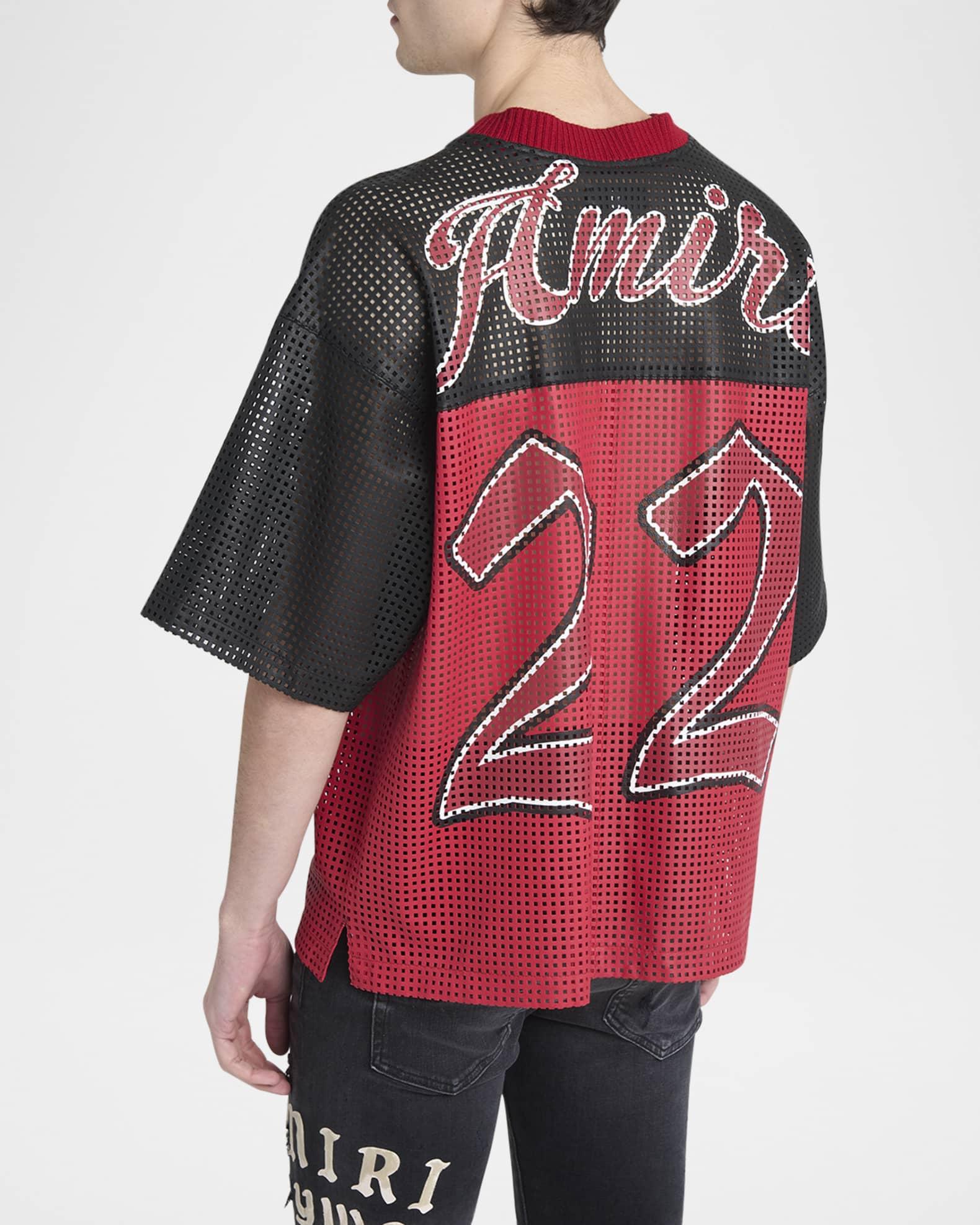 Amiri T-shirt in mesh leather revealing "22" numbering for a sporty aesthetic Maxi logo on the back Ribbed V-neckline Short sleeves Vented sides Oversized fit Pullover style Leather Dry clean Imported