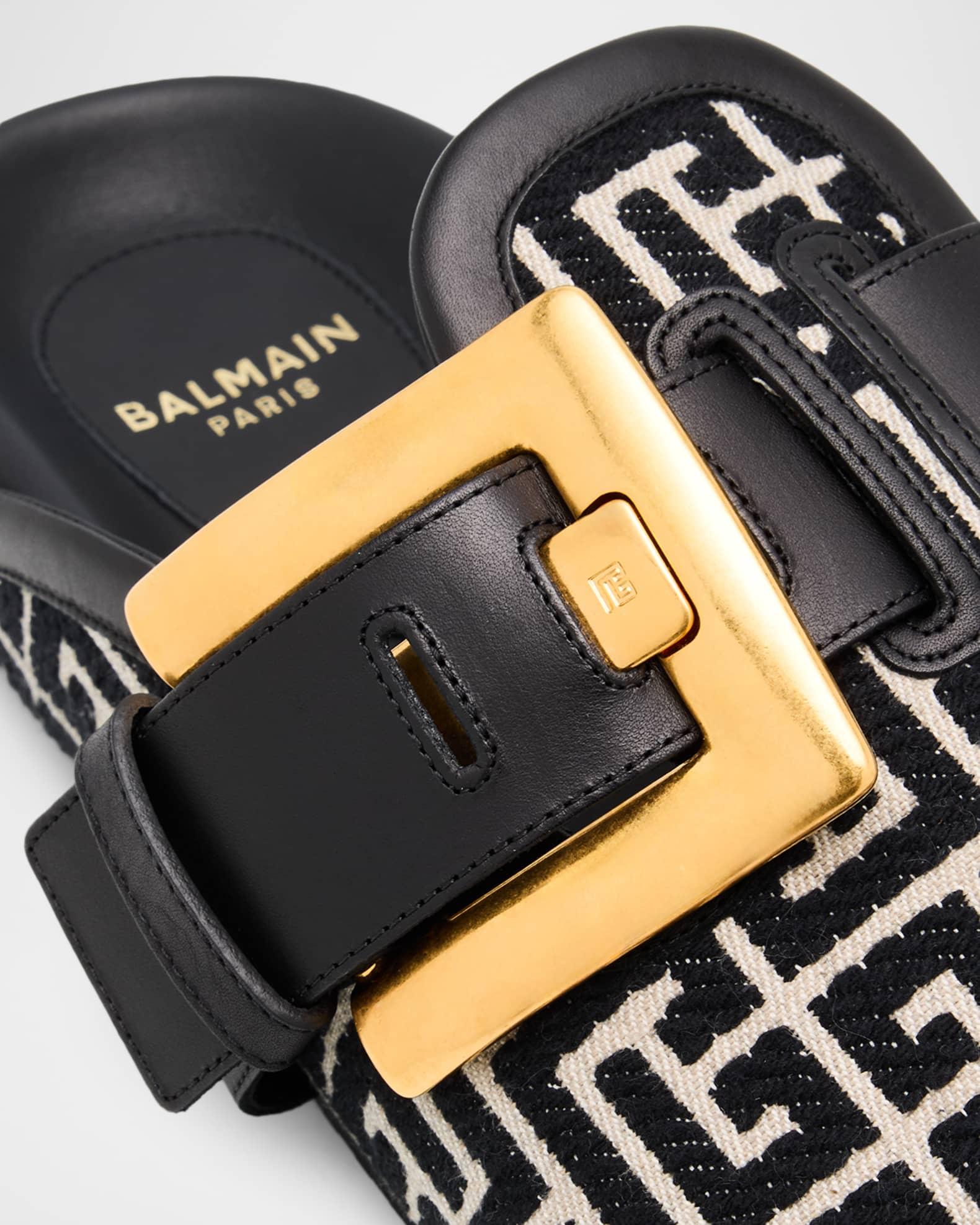 Balmain "Anthem" mules in jacquard canvas, displaying the iconic PB monogram for a bold statement Leather strap with an oversized gold-tone PB-engraved buckle Flat heel Round toe Leather lining Easy slide style Made in Italy