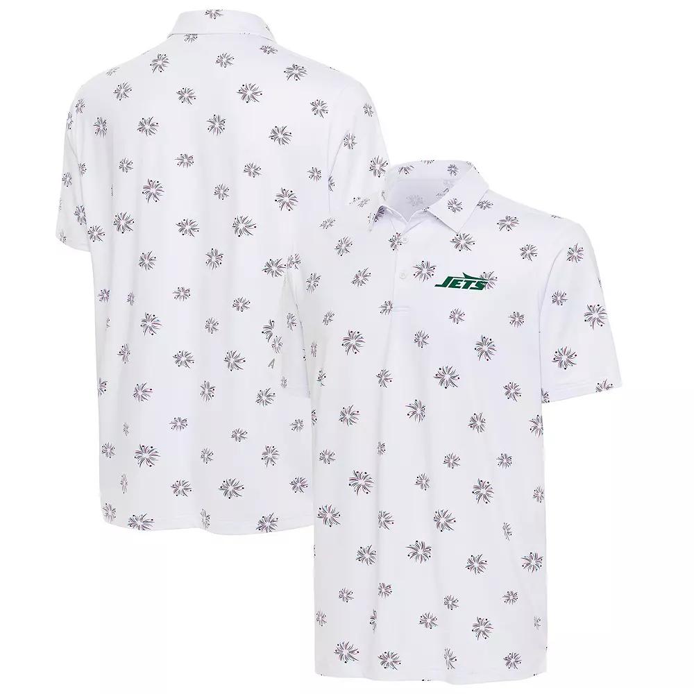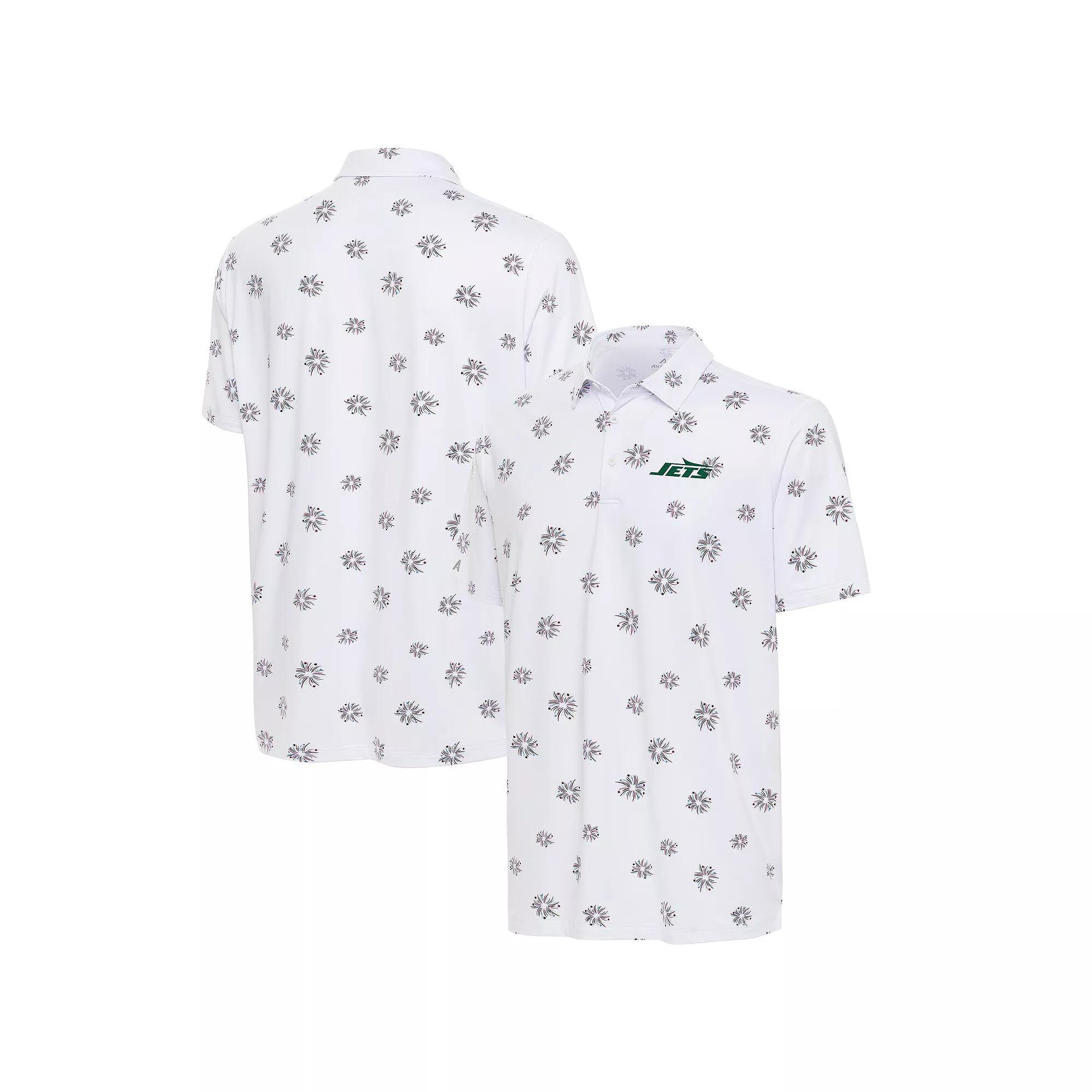 The Mens Antigua White New York Jets Fireworks Polo is a stylish and comfortable choice for any Jets fan. Embroidered graphics and side splits at the bottom hem add flair, while the self-fabric collar and three-button placket ensure a secure and comfortable fit. Made from a blend of polyester and spandex, this polo is perfect for showing support for the New York Jets both on and off the field.The Mens Antigua White New York Jets Fireworks Polo is a stylish and comfortable choice for any Jets fan. Embroidered graphics and side splits at the bottom hem add flair, while the self-fabric collar and three-button placket ensure a secure and comfortable fit. Made from a blend of polyester and spandex, this polo is perfect for showing support for the New York Jets both on and off the field.PRODUCT FEATURESShort sleeveSelf-fabric collarOfficially licensedMachine wash, tumble dry lowMaterial: 93% Polyester/7% SpandexSide splits at bottom hemBrand: AntiguaEmbroidered graphicsImportedThree-button placket Gender: male. Age Group: adult. Material: COTTON.